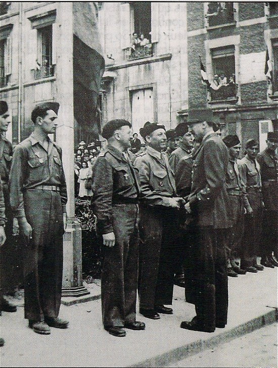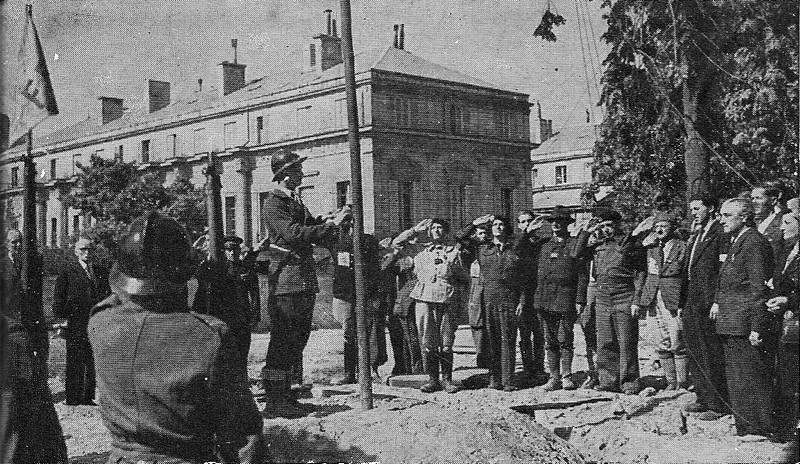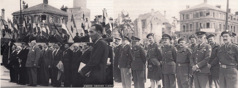 18 juillet 1945 place du Lycée à Caen. Le jeune FFI à gauche et Léon Dumis portent l'insigne de