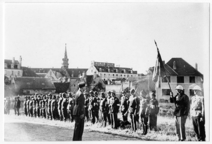 Source FB. Revue des anciens de la Compagnie Scamaroni par le général Koenig au quartier Lorge, le 18 juillet 1945.
