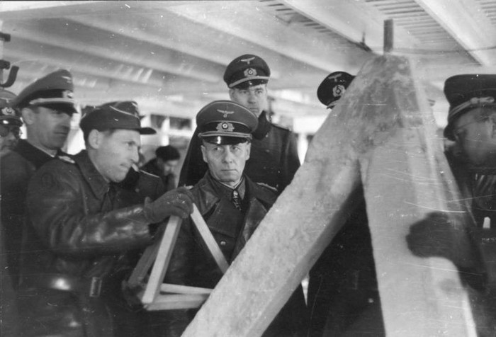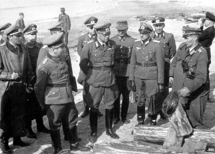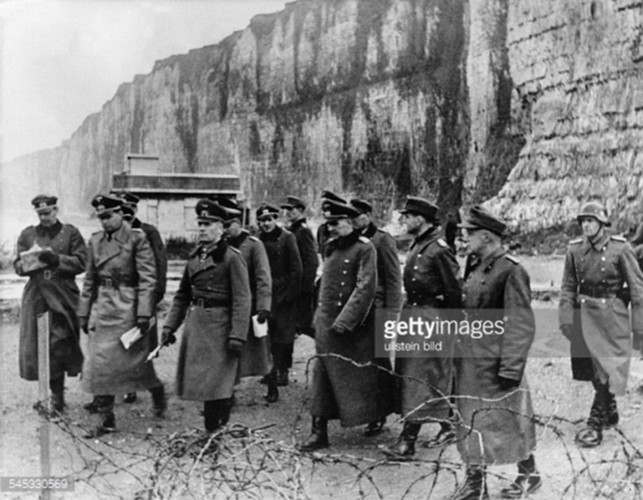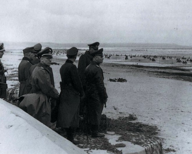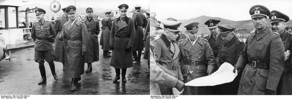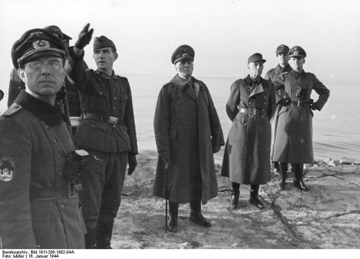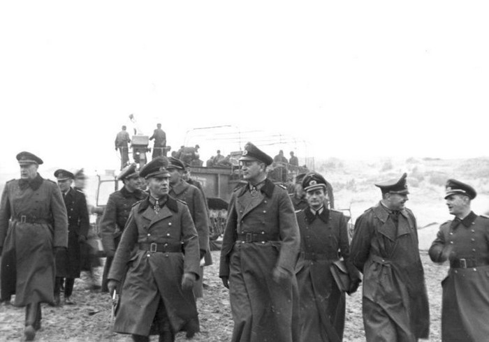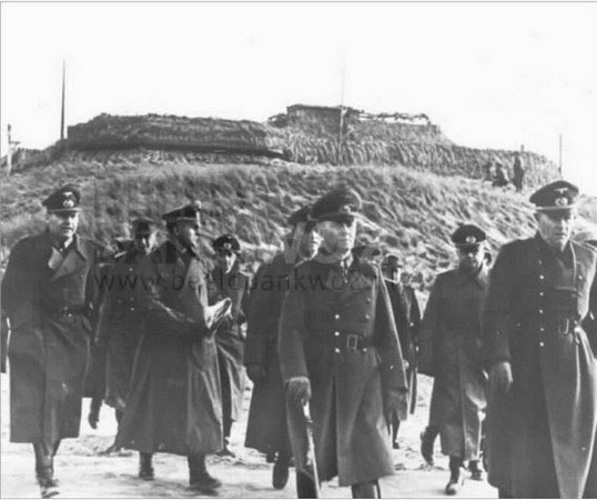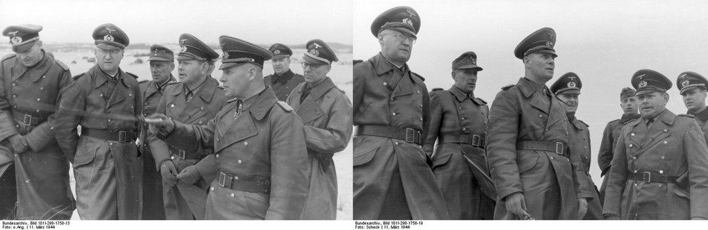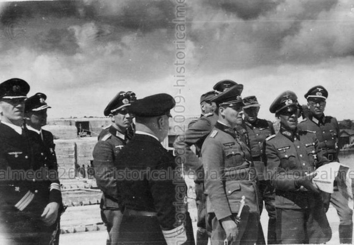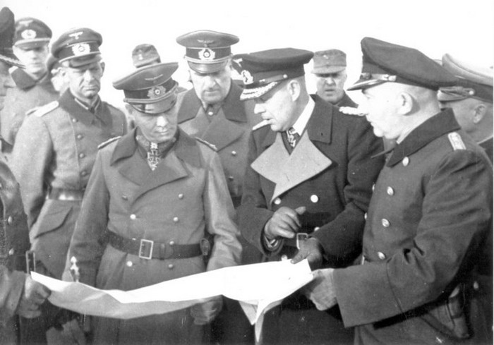 Source. Erwin Rommel avec le Vizeadmiral Friedrich Ruge, étudiait une carte à Hanstholm, Danemark, le 7 Décembre 1943. Entre Rommel et Ruge: le General der Infanterie Hermann von Hanneken, et à droite le "Verteidigungsbereich Hanstholm" Korvettenkapitän Dietrich Knippenber, Kdr du MARINEARTILLERIEABTEILUNG 118