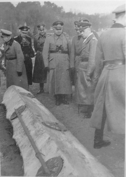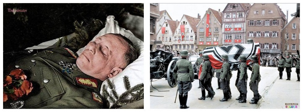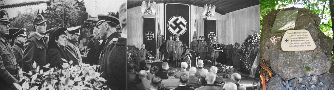 A gauche: Hauptmann Helmuth Lang, Manfred Rommel le fils du maréchal et son épouse Lucy-Maria. Hommage à Rommel lu par von Rundstedt, source: à droite sa tombe contenant ses cendres, source.