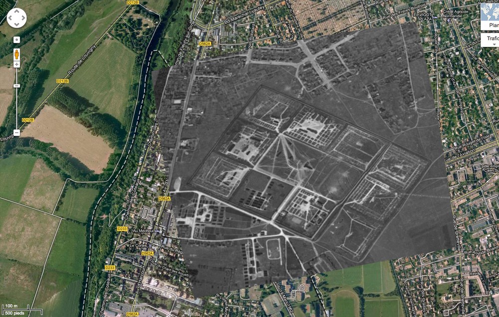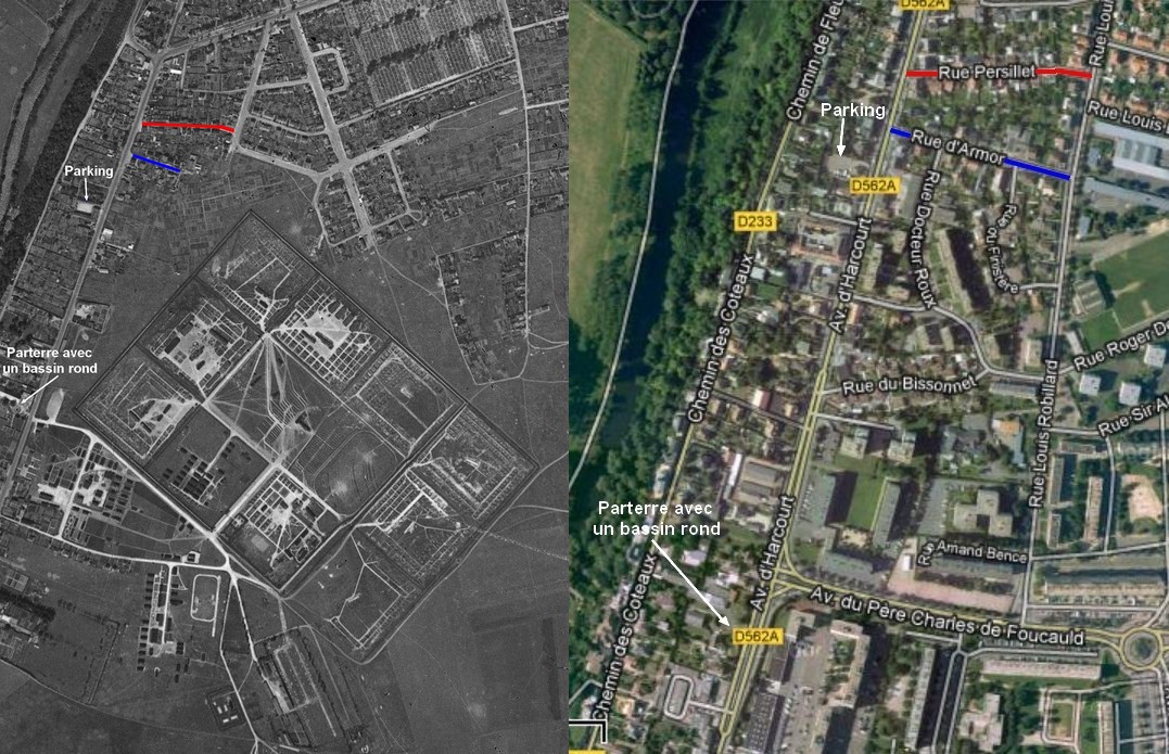 N'ayant trouvé aucune photo de ce camp, j'ai consulté le site géoportail de l'IGN qui met en ligne (après quelques manipulations !) des photos aériennes de 1947 (voir ici en plusieurs tailles). Comparons cette photo aérienne de 1947 avec une vue satellitaire de nos jours de Google maps: l'angle que fait la rue Persillet à l'Est, l'amorce de la rue d'Armor, en face à l'Ouest de la rue d'Harcourt un parking avec des voitures blanches qui correspond à un rectangle gris sur IGN 47 et à la même latitude que le coin supérieur Nord du camp ainsi que la pointe Ouest du camp à hauteur d'un parterre avec un bassin rond.