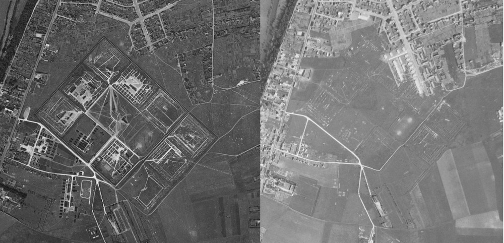 En bas de l'image l'ombre du château d'eau au Sud-sud-ouest du camp en 1947, et de nos jours.