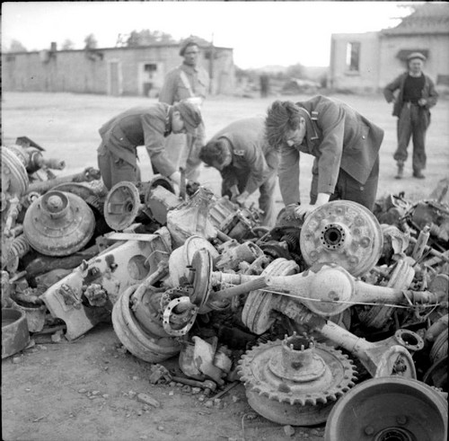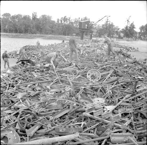 Pas de date pour ces deux photos, à gauche trois prisonniers allemands fouillent un tas d'essieux de camions, en arrière plan un civil et un garde de couleur ou Nord-africain, pas de localisation; à droite sur un quai à Hérouville le long du canal des prisonniers allemands sur un tas de ferraille, pour l'Angleterre selon la légende d'origine, dans le fond une grue sur portique.