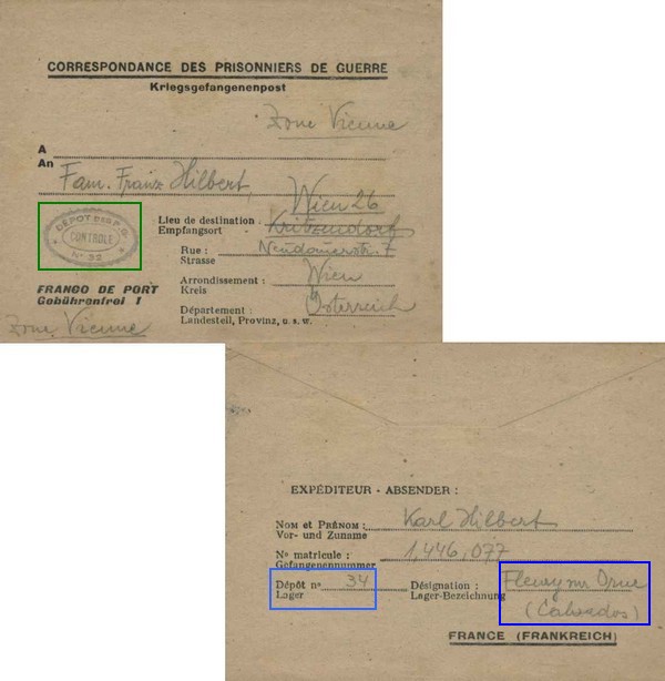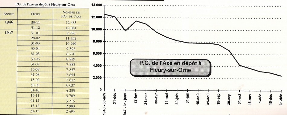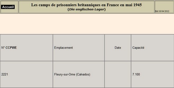 Grâce à notre recherche Internet, nous savons maintenant qu’il y avait à Fleury sur Orne un camp britannique N° 2221 de prisonniers allemands qui se trouvait à l'angle de l'avenue Père Charles de Foucauld et de l'Avenue d'Harcourt (commune de Caen). Il s’étendait au niveau de l'ex-Gendarmerie (Caserne LE FLEM aujourd'hui désaffectée) et suivait la route d’Harcourt vers le Sud. Les prisonniers étaient employés à déblayer les ruines ou à déminer les plages et les sites des combats comme la cote 112. En mai/juin 1945 le camp a été transféré aux autorités françaises avec 5 000 prisonniers. Le camp N° 34 en novembre 1945 à un effectif de 6 400 prisonniers, certains gardiens étaient des tirailleurs marocains.