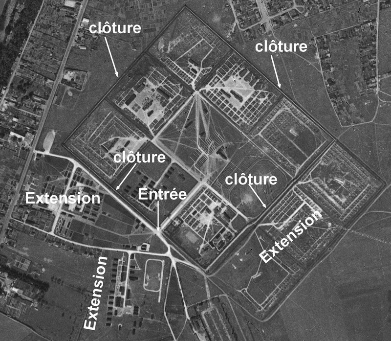 Si on examine ce camp, on note : une enceinte ceinturant les 9 cases de gauche, l'entrée au Sud entre les cases 2 et 3, une extension de 3 cases à l'Est sans clôture externe, une extension au Sud de la route d'accés et une autre extension au Sud. Les cases étaient pour les Alliés des "cages" éléments autonomes avec cuisine, latrines et chef de camp.
