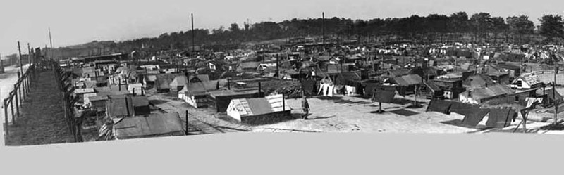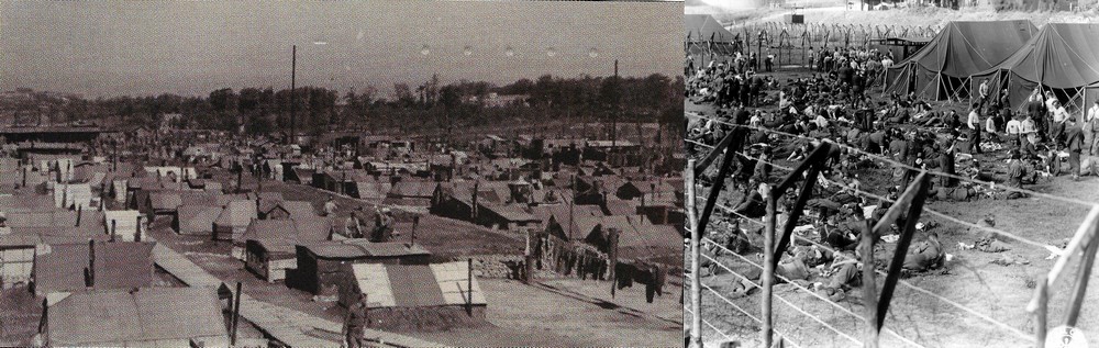 Pour se donner une idée de camps de prisonniers allemands, voici deux photos: à gauche, voir ci-dessous, photo CICR; à droite sous réserve à Isigny-sur-Mer, photo Conseil régional de Basse Normandie, National Archives USA.
