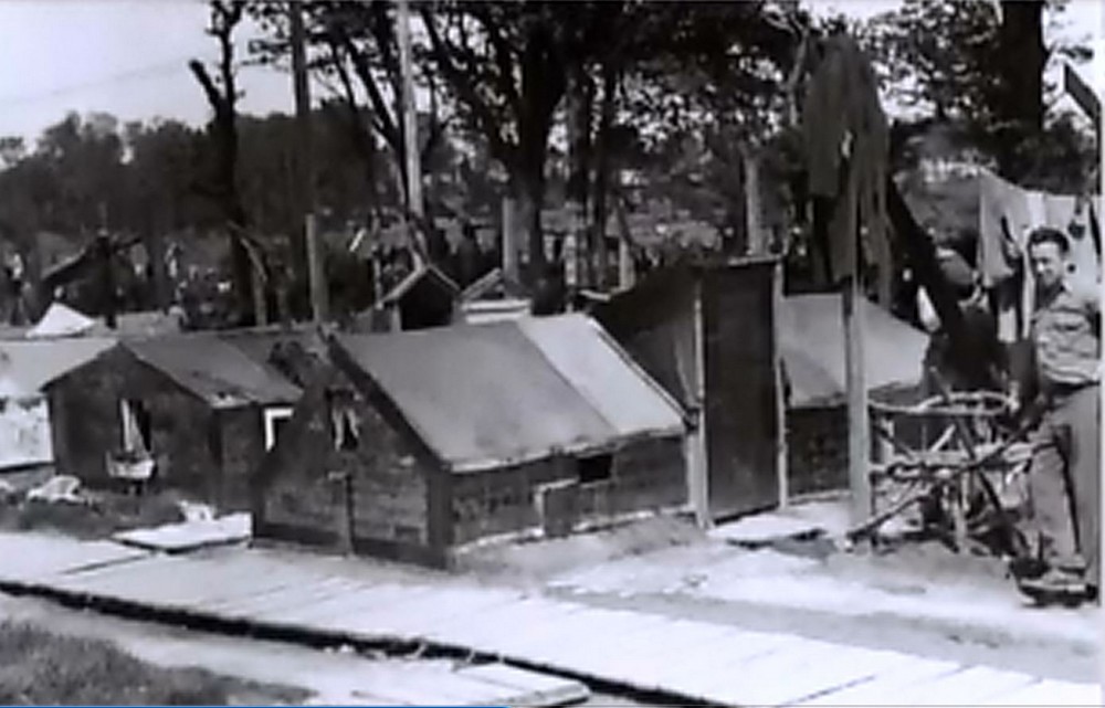 Source: capture d'écran du film "Les prisonniers du D-day" de Georges Guillot. Photo du camp de La Motterie à La Glacerie (Manche) montrant des baraques en bois construites par de la récupération faite par les prisonniers allemands.