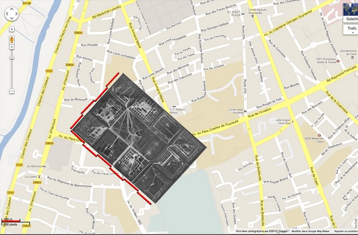 Montage localisant approximativement le camp sur les communes de Caen et Fleury sur Orne.
