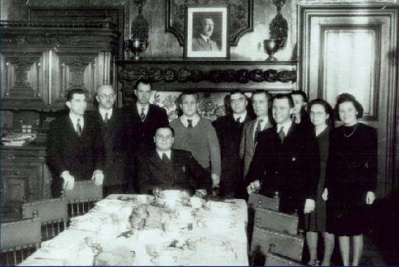 De gauche à droite : Kart Zaumzeil, Kart Melhose. Henrich Michaeliss, Herman Seif (assis), Maurer, Helmut Althaus, Karl Ludwig. Herbert von Bertholdi, Xavier Vetter (à demi caché), Käte Bustorf (interprète) et Gertrud Treiber (secrétaire)- Photo prise entre octobre 1943 et mars 1944.