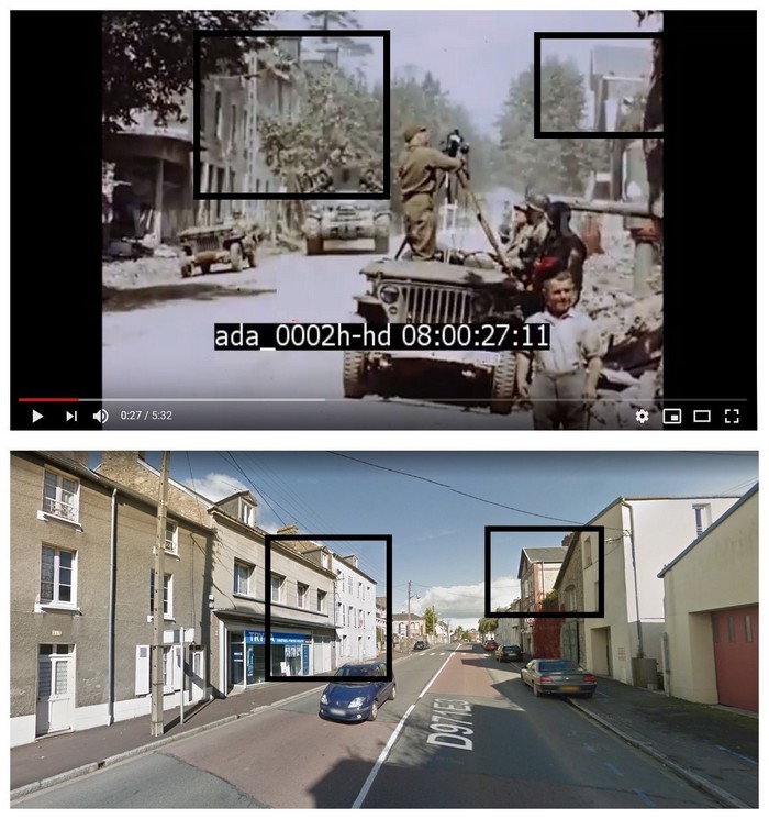 4e plan : 0 :21 à 0 :26 la caméra pivote de 180° au carrefour de la Croix Quillard devant l'avenue Maréchal Pétain (de nos jours avenue Division Leclerc), en regardant vers le Nord, toujours une caméra filmant une caméra, la Jeep au premier plan est devant celle de la photo de droite ici :