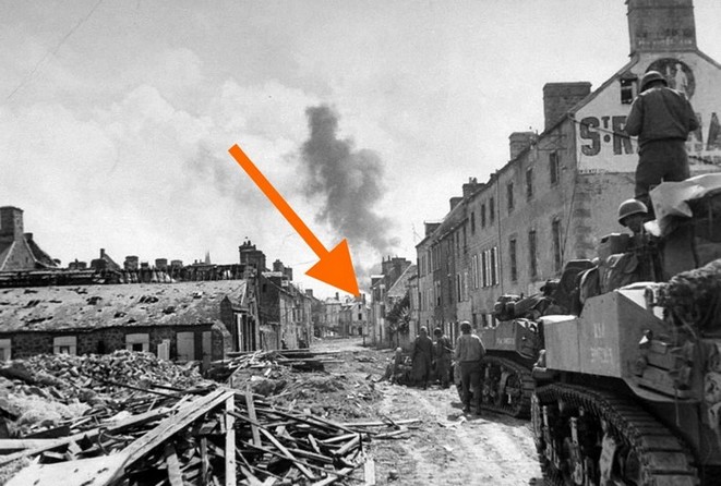 « Maison familiale devant laquelle le 30 Juillet a sauté sur une mine, exactement devant la porte de la maison, la jeep d’un Colonel américain, le Colonel Storck, au niveau du lampadaire qui se trouvait entre le 13 et le 15.