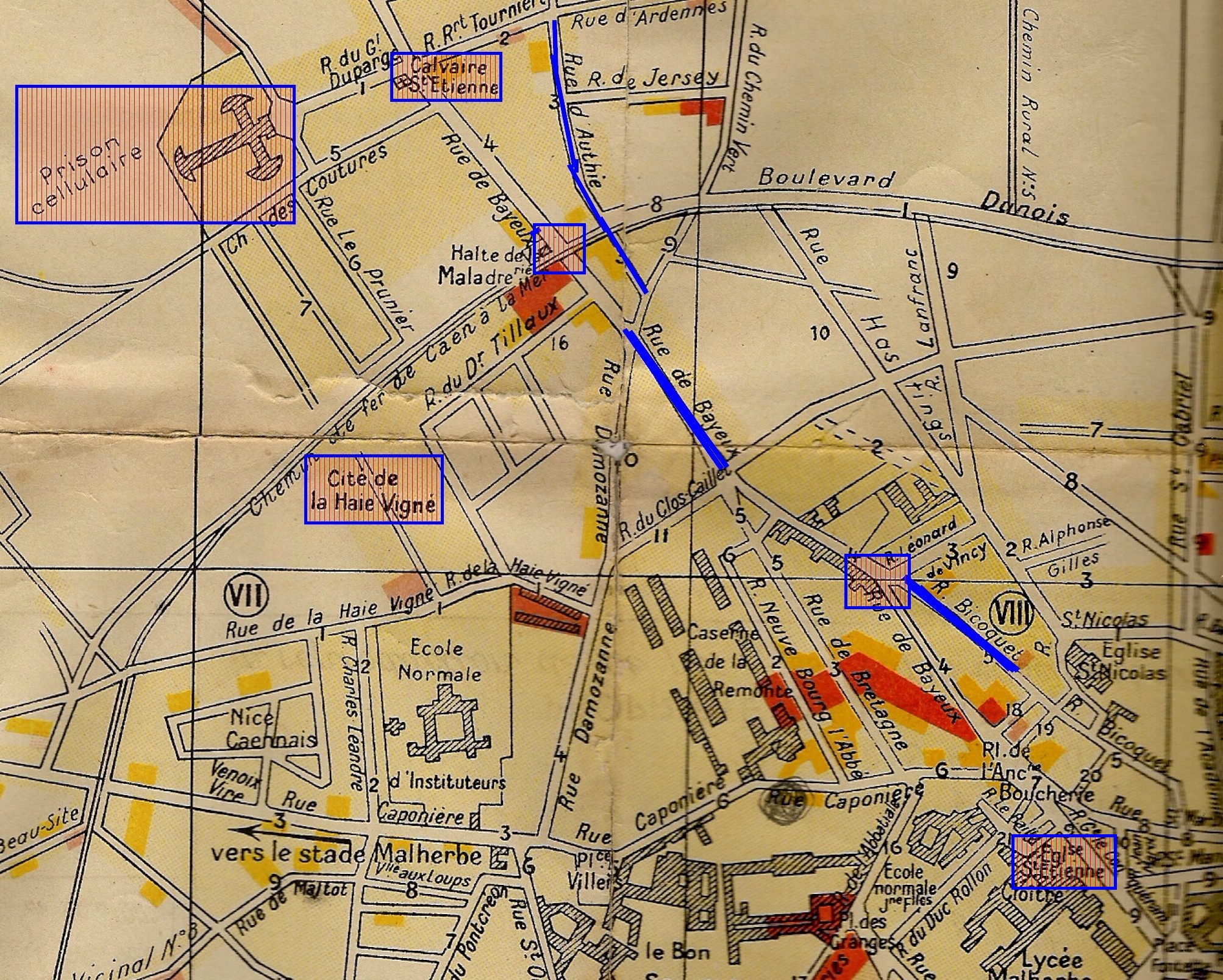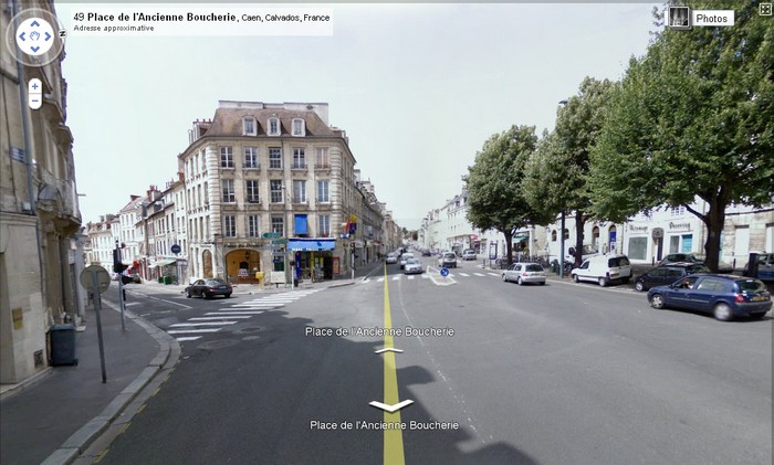 Vers 11 heures. des Panzern se mettent en position Place des Petites-Boucheries, l'un prenant en enfilade la rue de Bayeux, l'autre la rue Caponière. Quelques mitrailleuses s'y ajoutent... les dernières arrière-gardes. Vers midi, elles se retirent à leur tour.