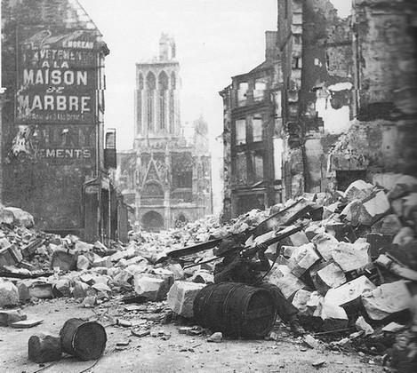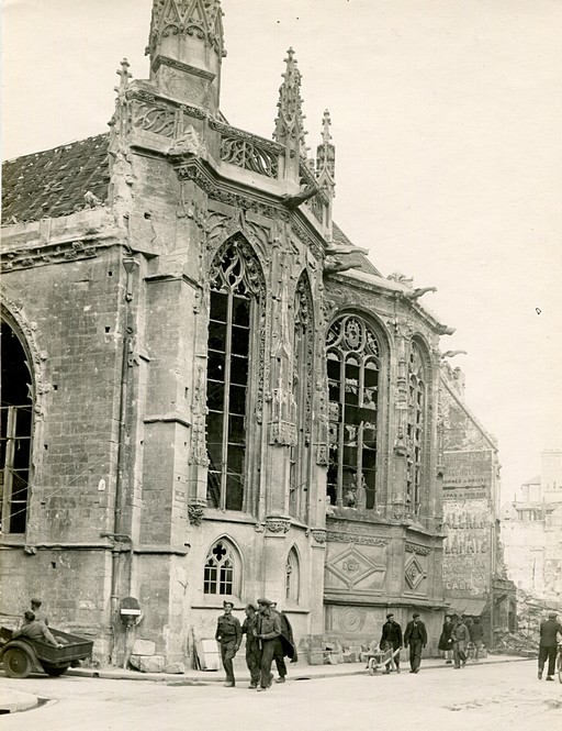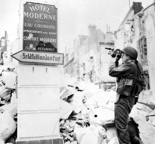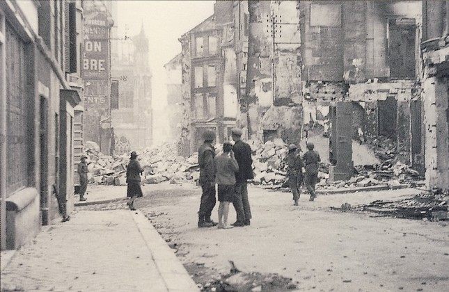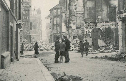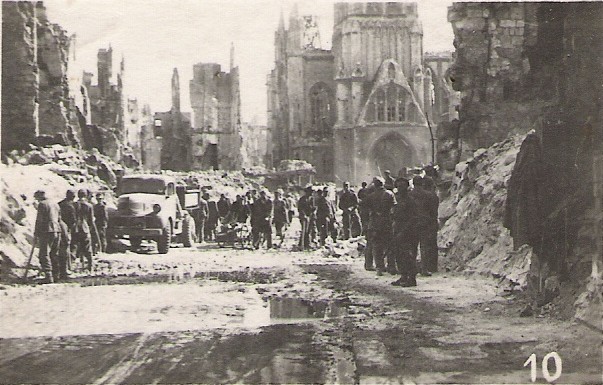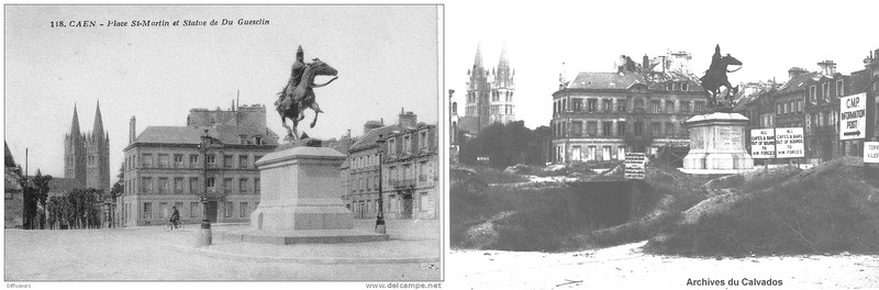 Nous montons à l'étage supérieur d'un petit immeuble d'où on découvre un panorama de Caen. C'est curieux comme, à distance, cette ville ne semble pas avoir été touchée par la guerre. Il faut un effort d'attention pour se rendre compte de l'immensité des destructions. Car, de l'Abbaye-aux-Hommes à l'Abbaye-aux-Femmes,(sic!) entre ces clochers debout comme autrefois, Caen, qui n'existe plus et ne vit plus, semble toujours exister.