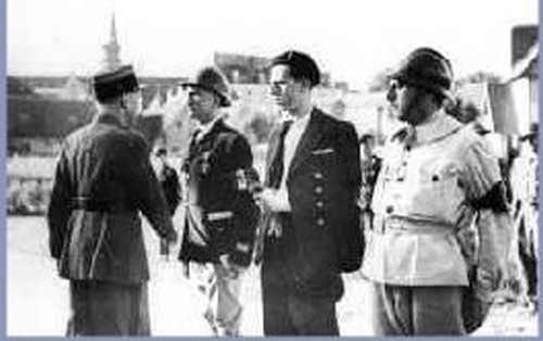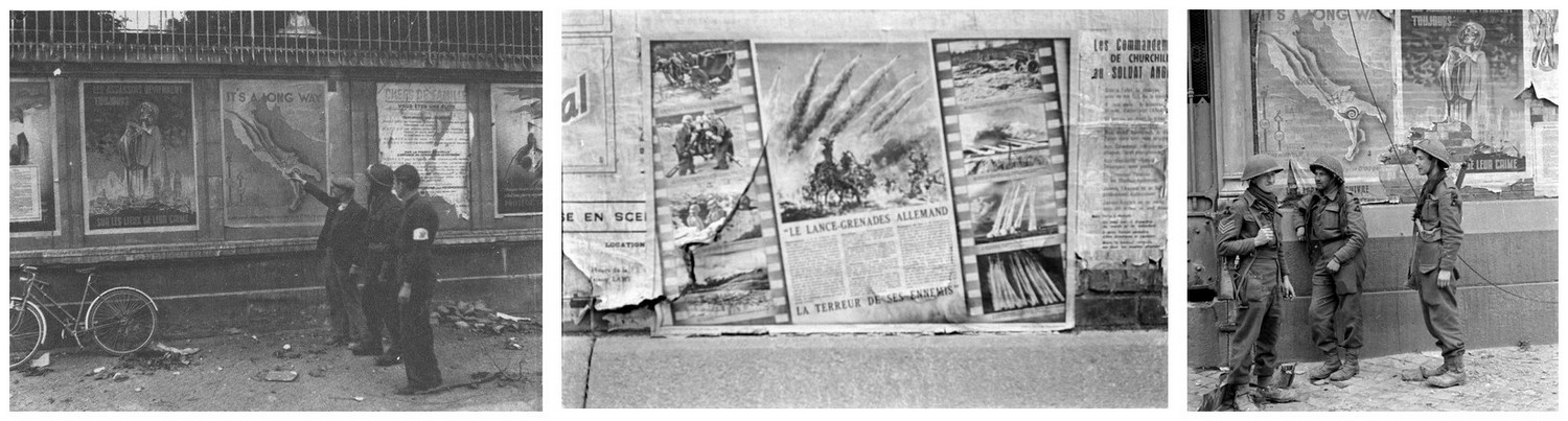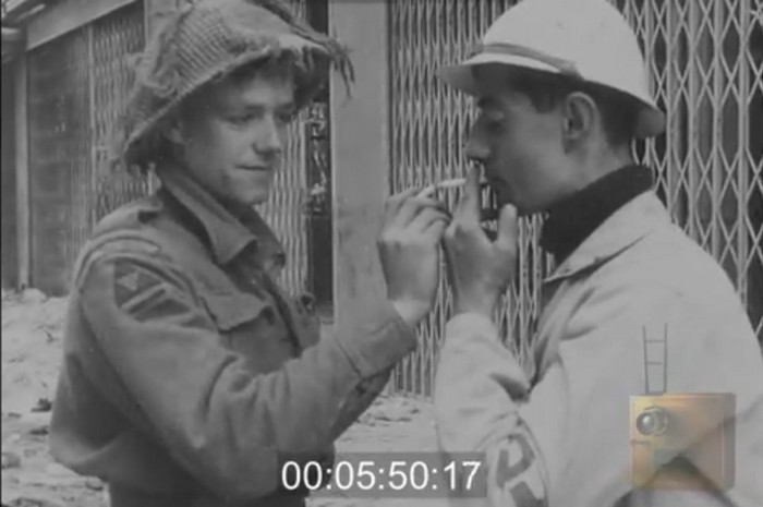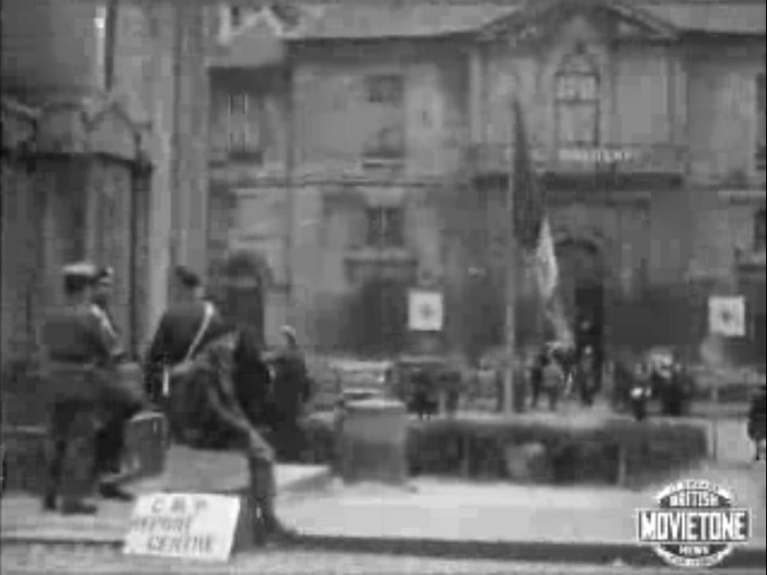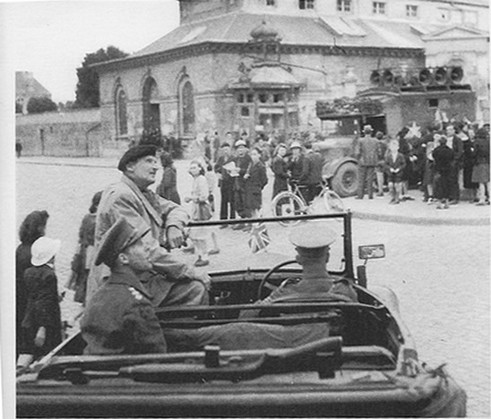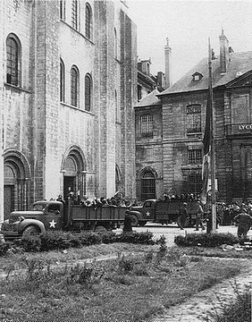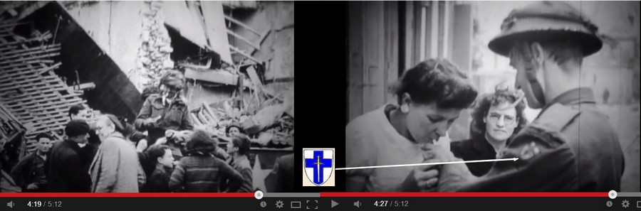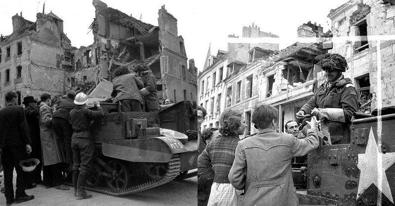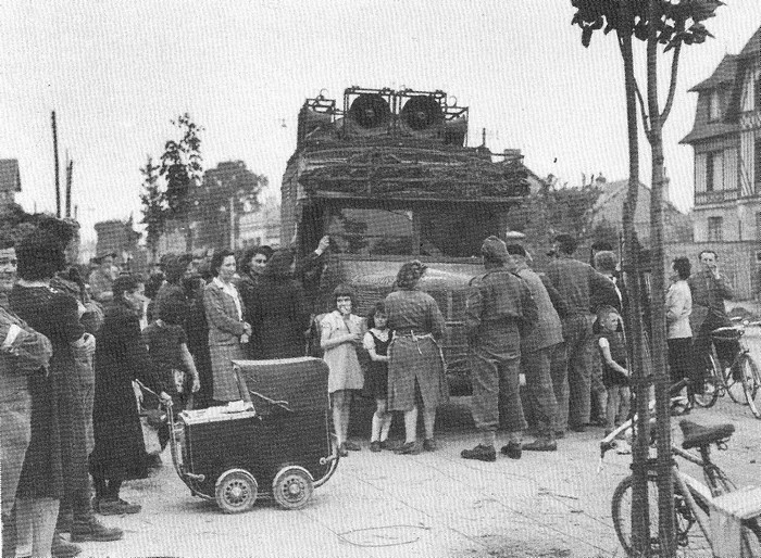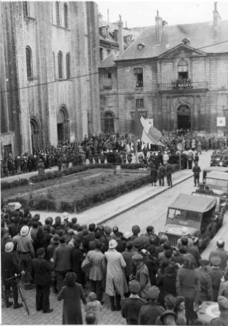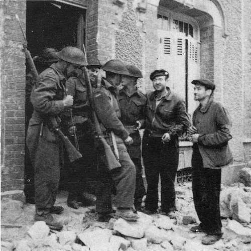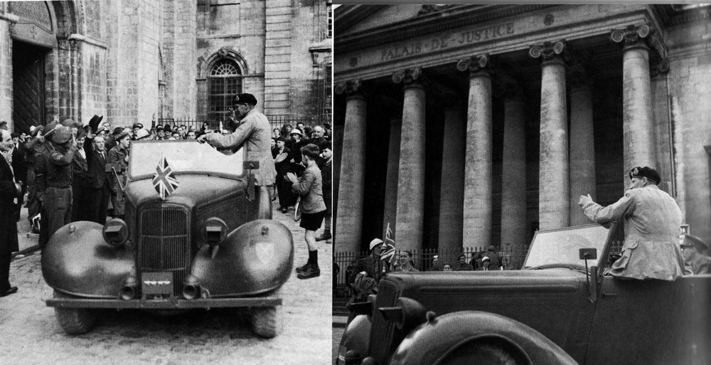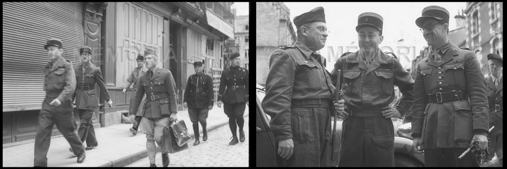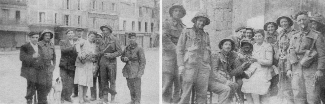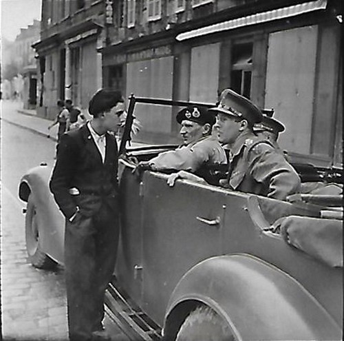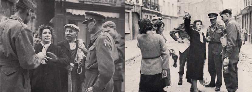 et les officiers des "Civil Affairs" à Vaucelles libéré. On hisse le drapeau