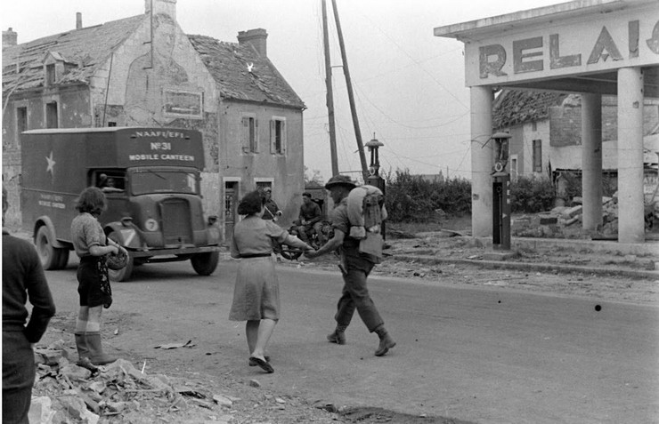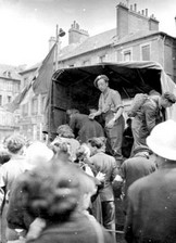 , nous apprenons que le préfet prend possession de Vaucelles, libéré hier. Pour nous y rendre nous traversons le quartier du port, plus ravagé, plus en désordre que les autres, si c'est possible. des ponts ont déjà été jetés sur l'Orne: c'est une étonnante réussite car les lus lourds camions peuvent les emprunter. En traversant Vaucelles moins définitivement détruit que Caen, j'arrive à grand*peine sur le lieu de la cérémonie comme elle vient de s'achever. Mais je peux parler avec quelques personnes qui nous disent spontanément ce que disaient les habitants de Caen le jour de leur libération: leur haine de l'Allemand. (Note de MLQ: cérémonie au grand calvaire du Cygne de Croix rue de Falaise/Bd Leroy avec le préfet Pierre Daure