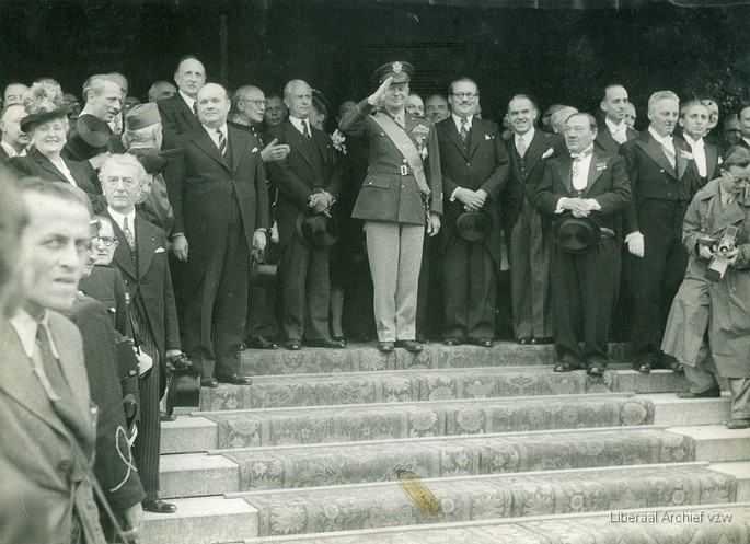 A gauche: Eisenhower, Président Truman à l’aéroport de Bruxelles, à gauche l’ambassadeur des USA en Belgique Charles Sawyer, à droite le Secrétaire d’Etat James Byrnes, le 15 juillet 1945. Source.