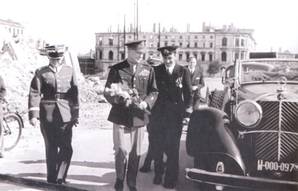 Source. Eisenhower à Varsovie en Pologne. Source Eisenhower avec un bouquet de fleurs et une Mercedes 770.