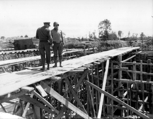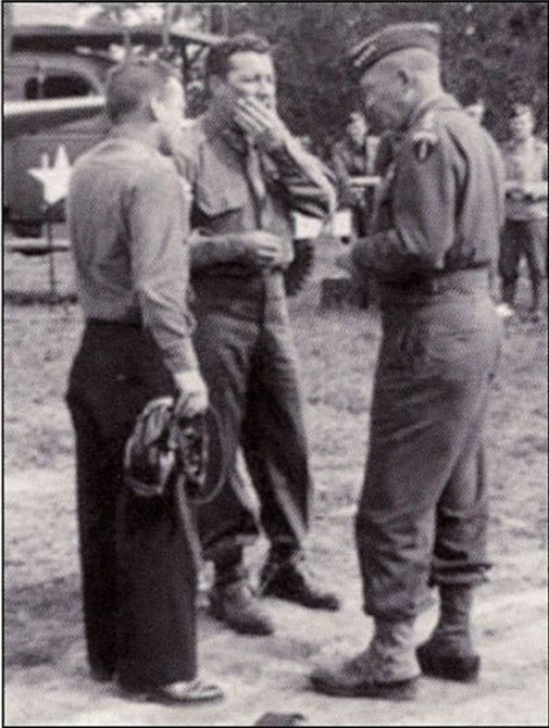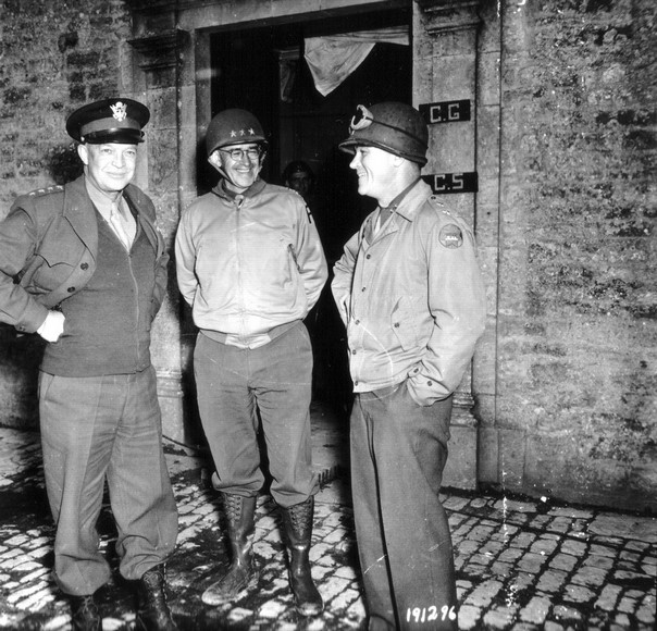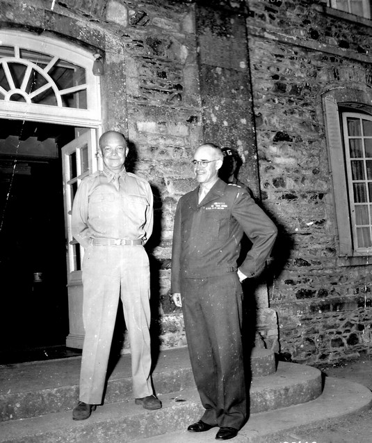 Source. Eisenhower et Clay (Bradley entre les deux) à Gatow (Allemagne) en juillet 1945.