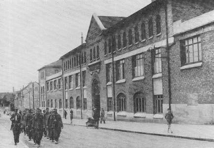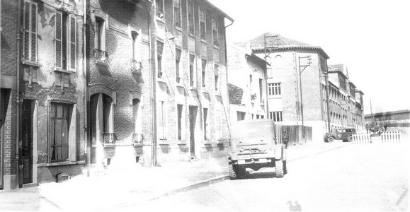 Le 5 mau 1945 à 17H00 arrivée au Collège Moderne et Technique, rue Jolicoeur à Reims, en arrière-plan l'Oberst Poleck.