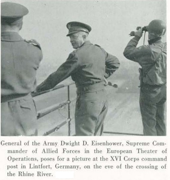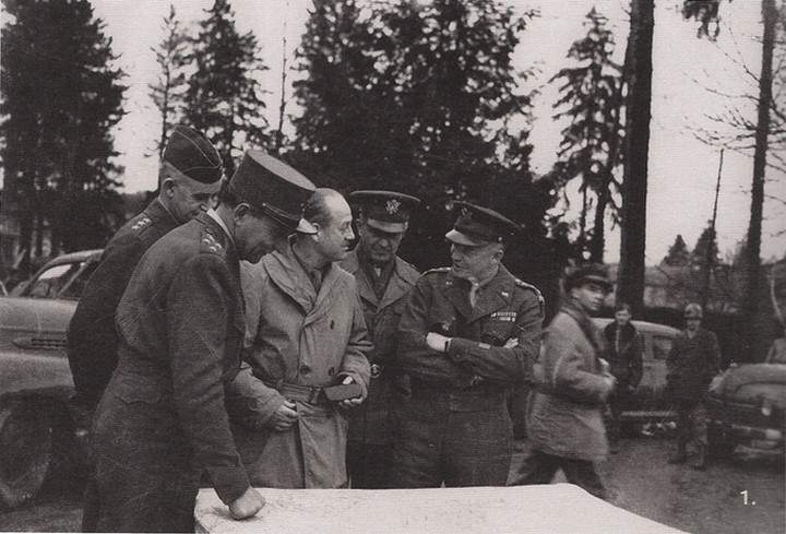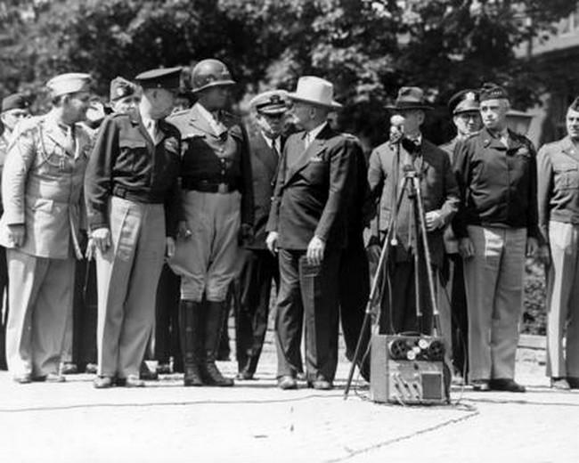 Source. Devant l’U. S. Group Control Council Headquarters à Berlin. De g. à d.: Brig Gen Harry H. Vaughan, Eisenhower, Patton, President Truman, Secretary of War, Henry L. Stimson et Bradley.
