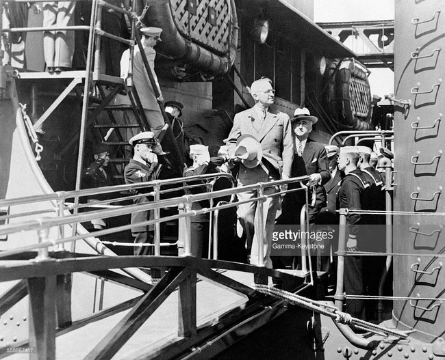 Source. Truman et Byrnes descendent du USS Augusta à Anvers, le 15 juillet 1945.