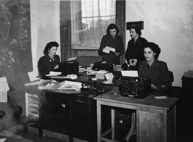 Women’s Army Corps secretarial staff from left: Margaret Chick, Frances Smith, Nana Rae and Sue Sarafian work inside Gen. Dwight D. Eisenhower’s office in Frankfurt, Germany in 1945. Source.