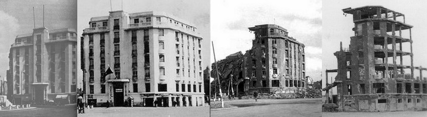 Hôtel Malherbe, montage: avant guerre, pendant l'occupation, après les bombardements, après guerre pendant le déblaiement. Aujourd'hui.