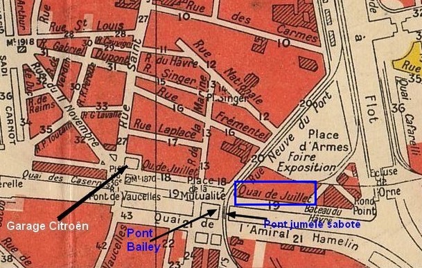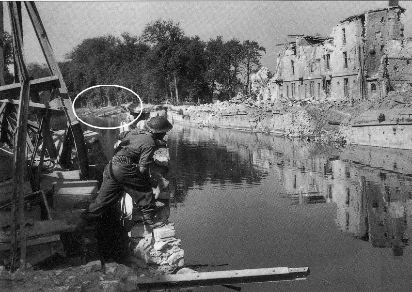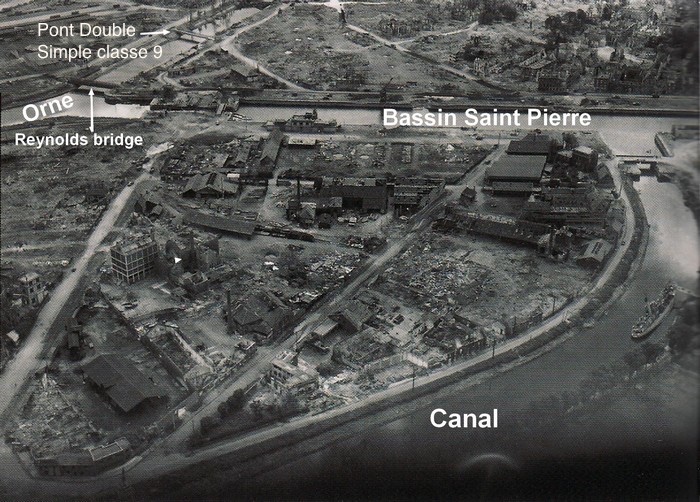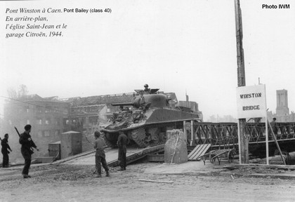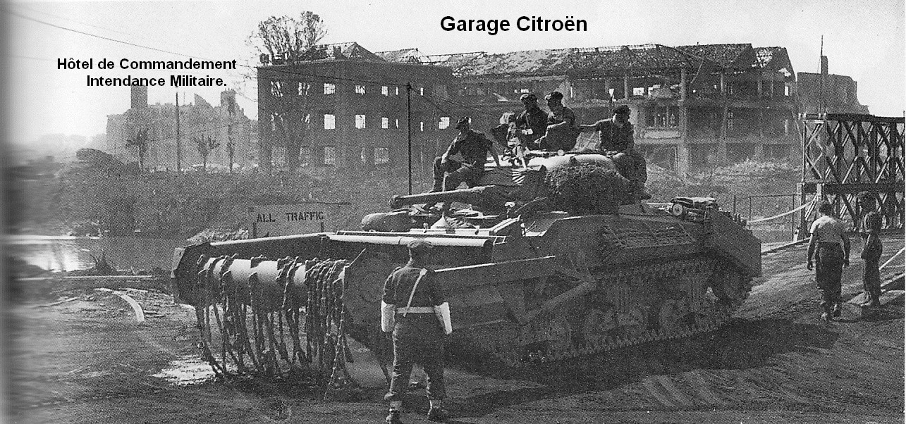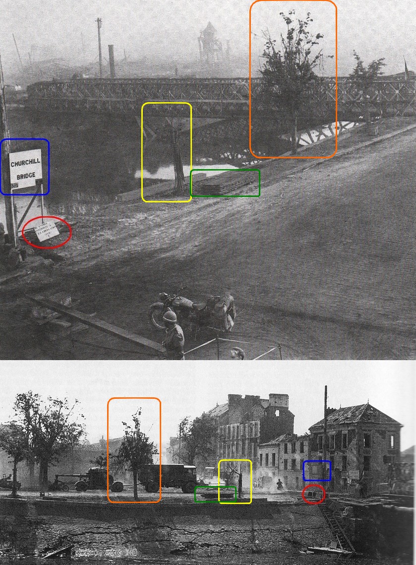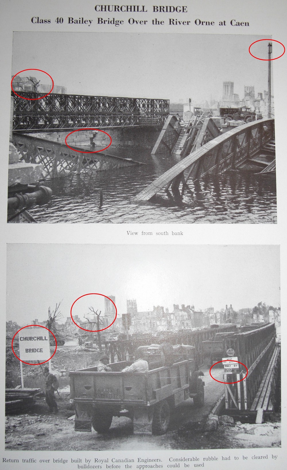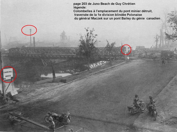 Le photographe se tient dans les étages de la maison qui fait l'angle entre le quai Amiral Hamelin et la rue de la Gare, à l'extrême droite de cette photo. Voir le repérage. En arrière-plan les ruines du Moulin de Calix. La légende d'origine est erronée il s'agit du Churchill Bridge voir les tabliers du pont de la Mutualité sabotés par les Allemands le matin du 9 juillet. Photo prise début août, la 1ère Division blindée polonaise débarque le 1 août à Arromanches se regroupe au sud de Bayeux, est rattachée au II Cdn Corps le 7 août et participe à Operation Totalize à partir du 8. Ce qui pose problème, c'est la pancarte à gauche de la photo à cet endroit c'est le Winston Bridge !