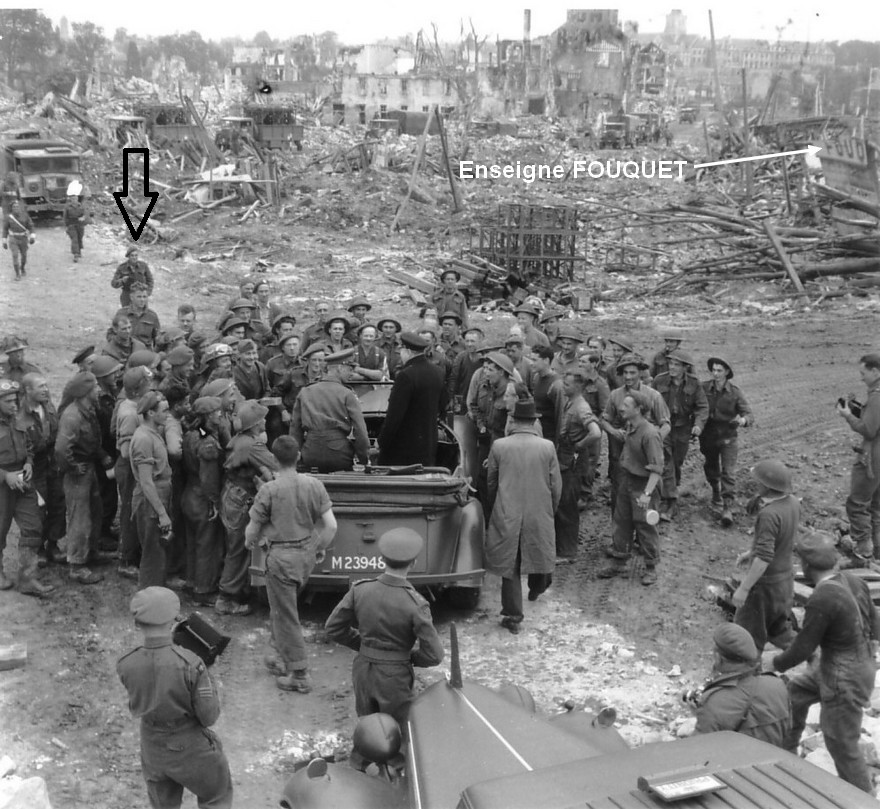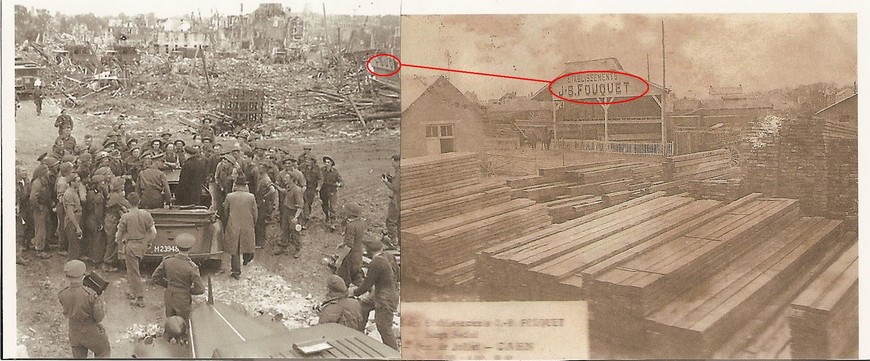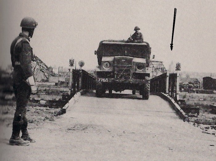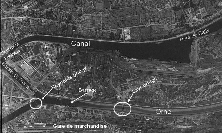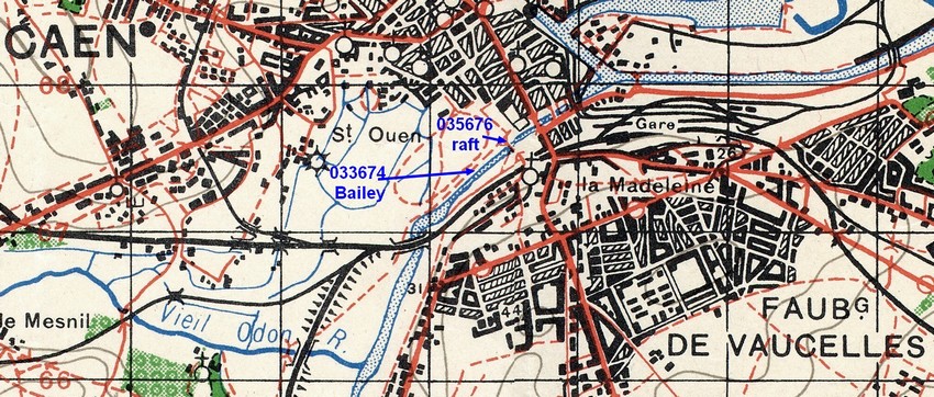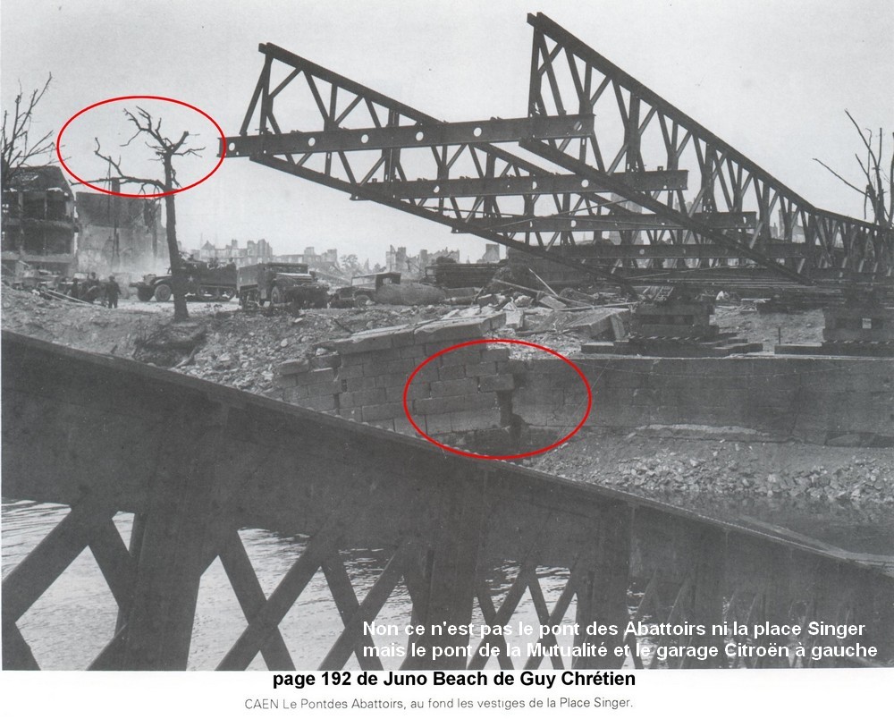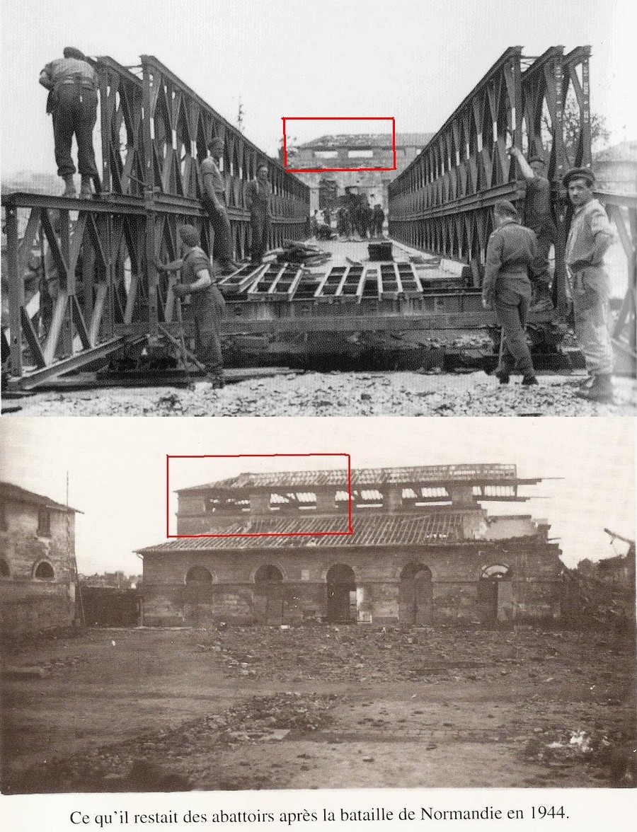 Le photographe se tient dans les étages de la maison qui fait l'angle entre le quai Amiral Hamelin et la rue de la Gare, à l'extrême droite de cette photo. Voir le repérage. En arrière-plan les ruines du Moulin de Calix. La légende d'origine est erronée il s'agit du Churchill Bridge voir les tabliers du pont de la Mutualité sabotés par les Allemands le matin du 9 juillet. Photo prise début août, la 1ère Division blindée polonaise débarque le 1 août à Arromanches se regroupe au sud de Bayeux, est rattachée au II Cdn Corps le 7 août et participe à Operation Totalize à partir du 8. Ce qui pose problème, c'est la pancarte à gauche de la photo à cet endroit c'est le Winston Bridge !