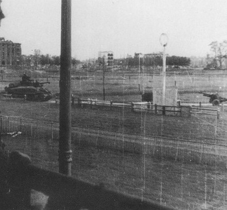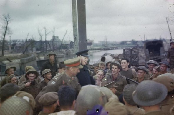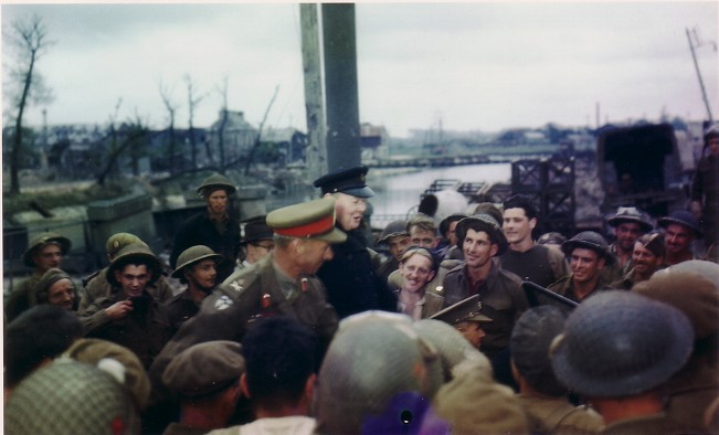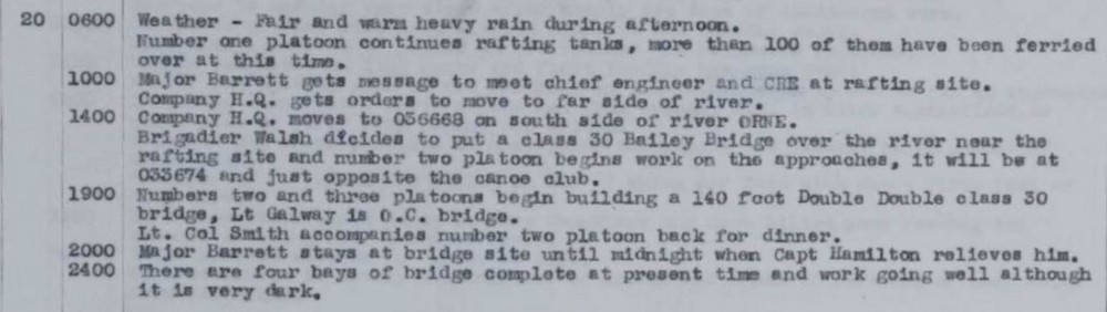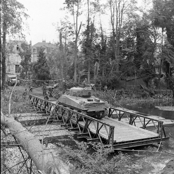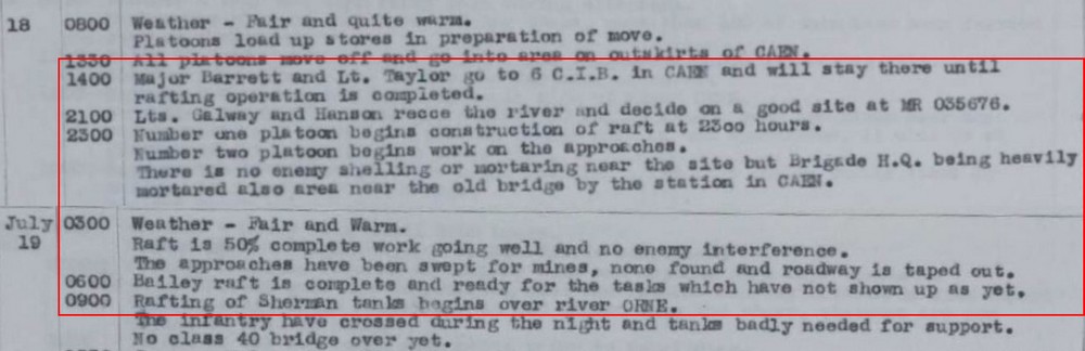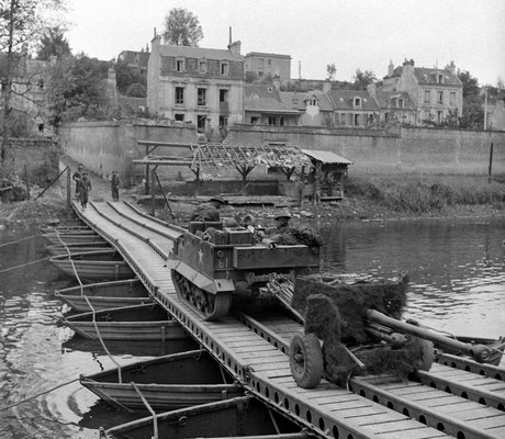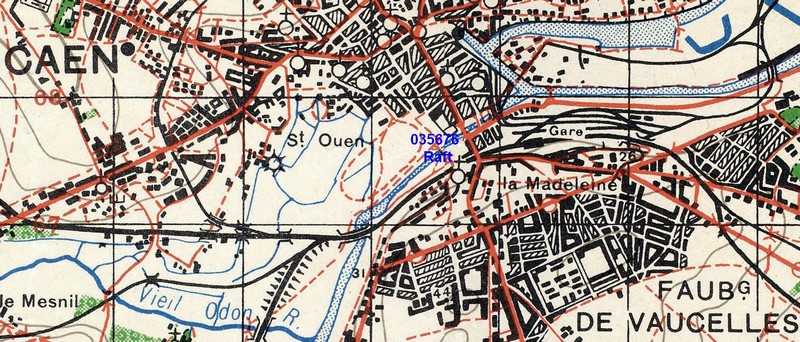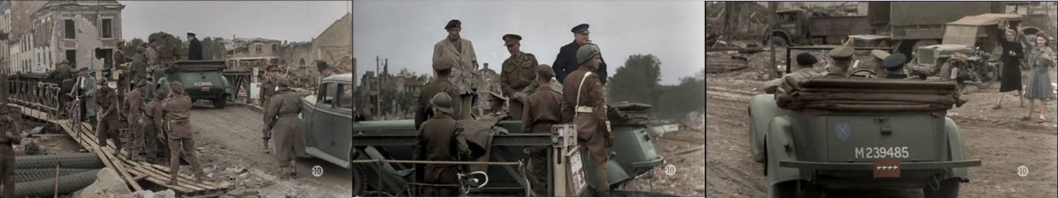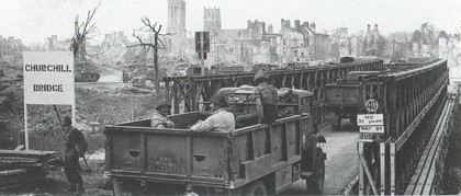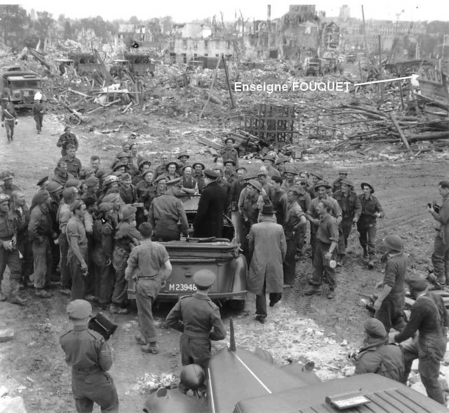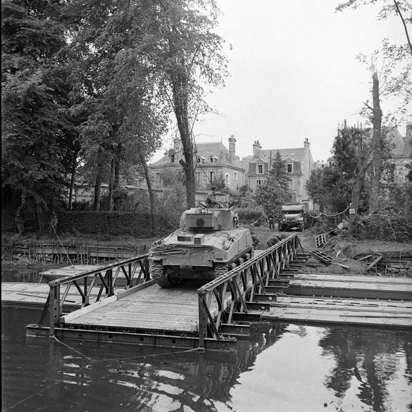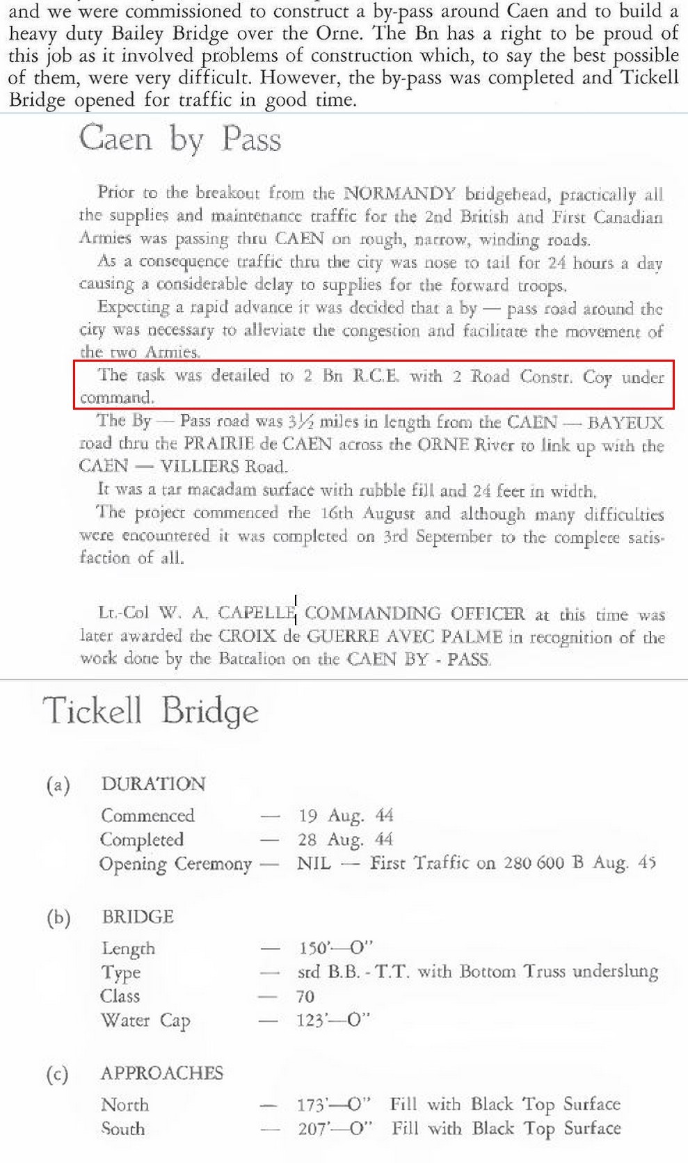Le photographe se tient dans les étages de la maison qui fait l'angle entre le quai Amiral Hamelin et la rue de la Gare, à l'extrême droite de cette photo. Voir le repérage. En arrière-plan les ruines du Moulin de Calix. La légende d'origine est erronée il s'agit du Churchill Bridge voir les tabliers du pont de la Mutualité sabotés par les Allemands le matin du 9 juillet. Photo prise début août, la 1ère Division blindée polonaise débarque le 1 août à Arromanches se regroupe au sud de Bayeux, est rattachée au II Cdn Corps le 7 août et participe à Operation Totalize à partir du 8. Ce qui pose problème, c'est la pancarte à gauche de la photo à cet endroit c'est le Winston Bridge !
