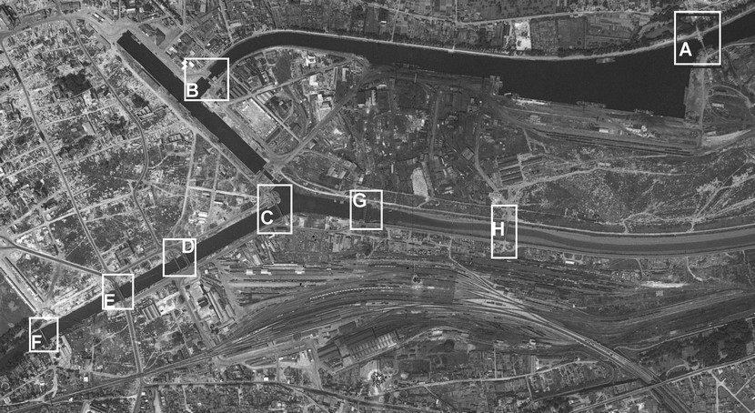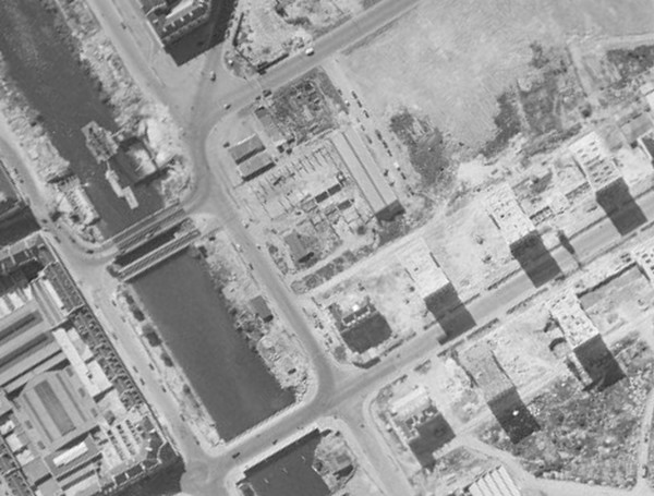 Photo aérienne RAF du 2 octobre 1944. Au centre en haut le Winston bridge entre la rue de la Gare et la rue de la Marine qui se termine par l'Andy's Alley jusqu'au boulevard des Alliés. Sur la version agrandie on remarque que le Winston bridge a été doublé (deux tabliers) et que le Churchill bridge est démonté. AGRANDISSEMENT.