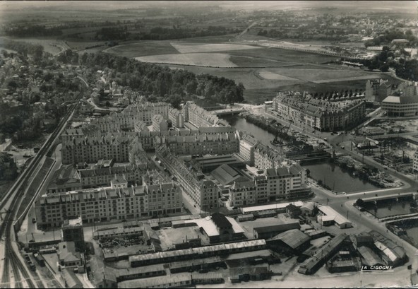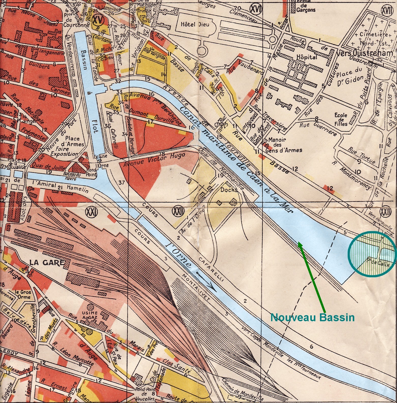 Le double pont (ferroviaire et routier) de La Mutualité ou le pont du Tortillard codé C4 qui relie la place de La Mutualité et le quai Hamelin (la gare SNCF). Le pont ferroviaire pour la desserte du port. Vue de la rive droite dans le fond la caserne Hamelin. A droite: Crédit : Fonds A. Léger, Archives du Calvados, 110FI.