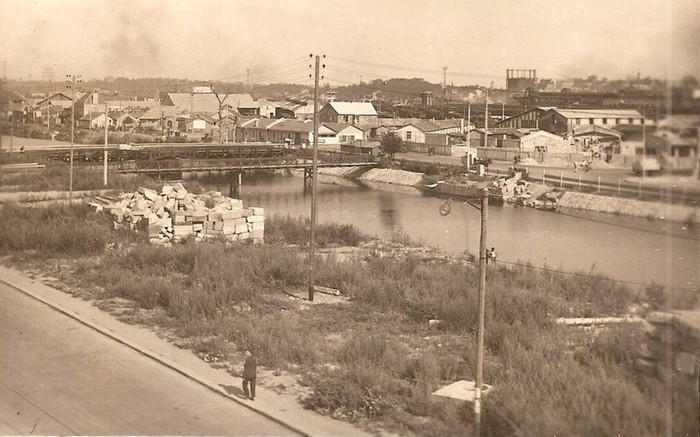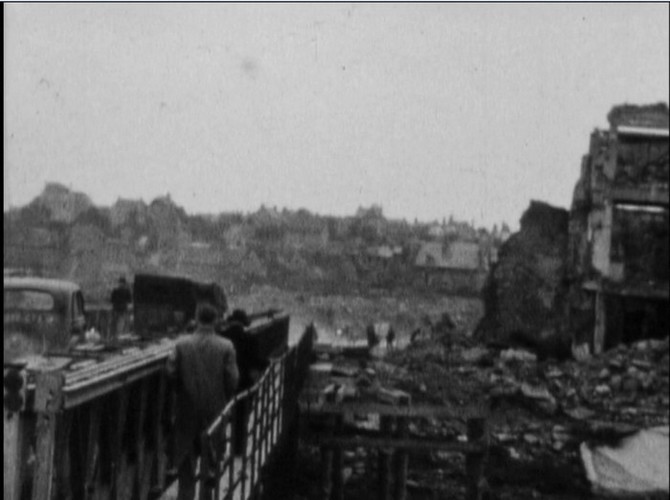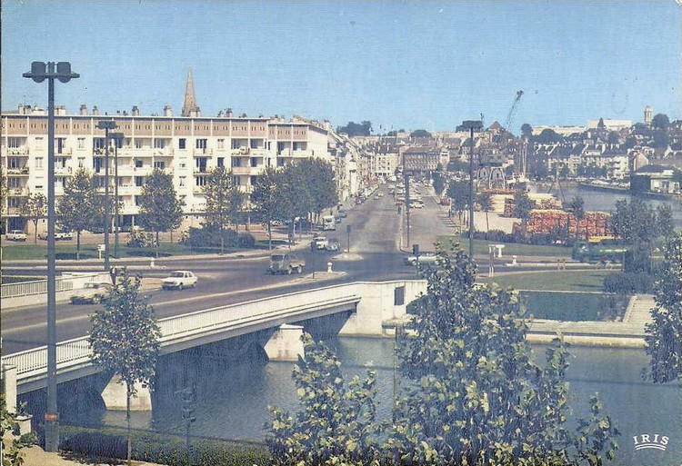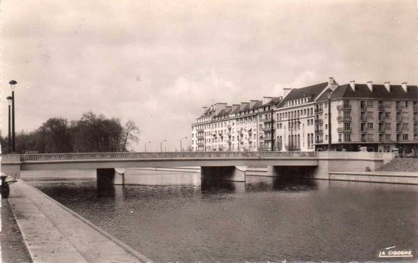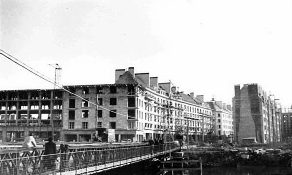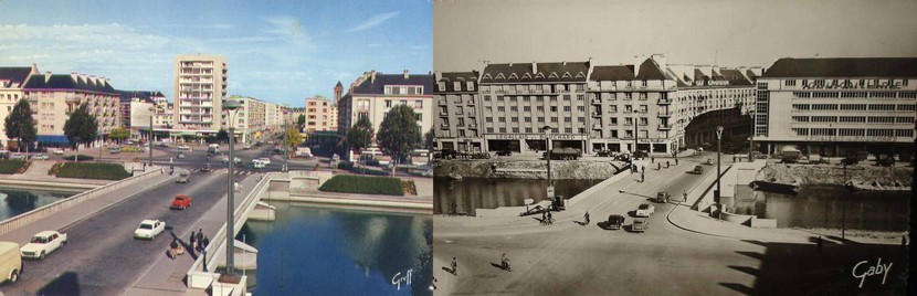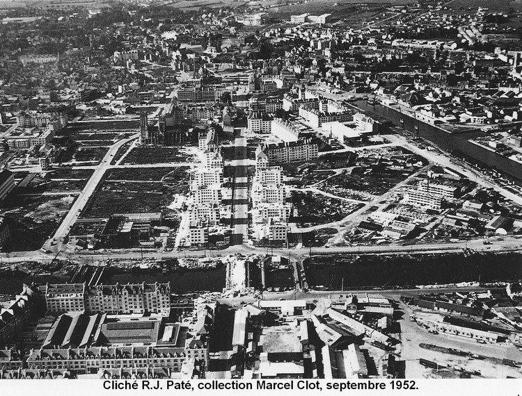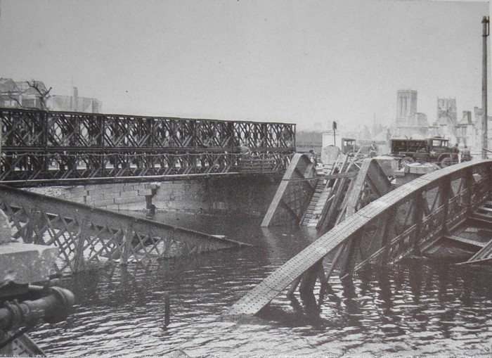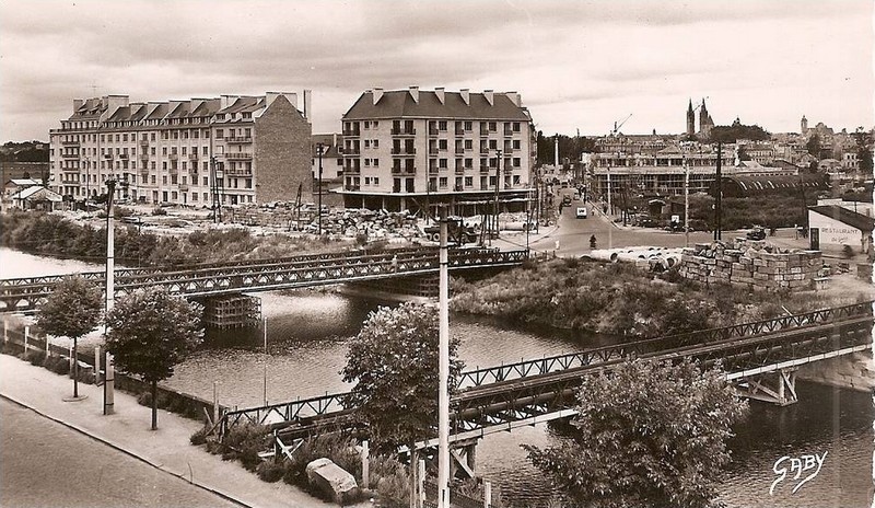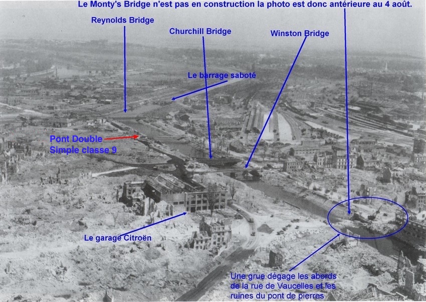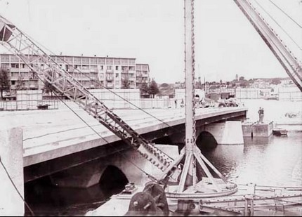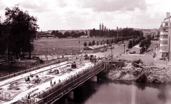 Monty's bridge en 1949, le photographe est rive gauche, reconstruction de la rue de Vaucelles, de nos jours.