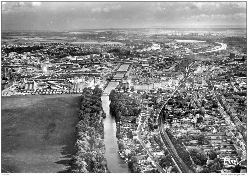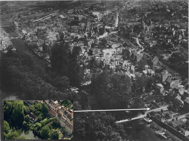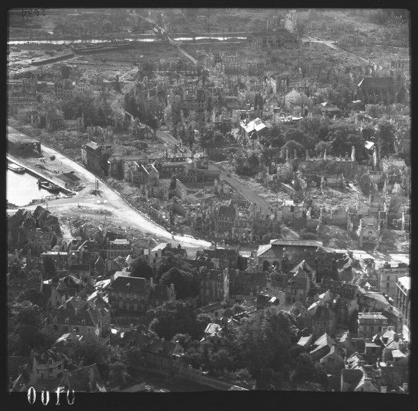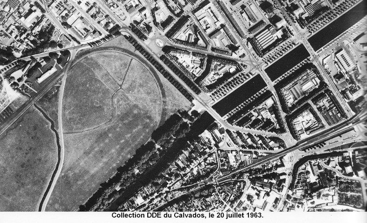 "Photo collection Heintz, Caen à 9 000 mètres le 6 juillet 1944" après un mois de bombardements aériens, de nombreux impacts de bombes dans la Prairie, en bas à gauche les bords de l'Orne ( les ruines de la caserne Hamelin et du garage Citroën); de gauche à droite: le pont de Vaucelles en ruines, la Nouvelle Passerelle (elle a été détruite ce jour la), le viaduc ferroviaire après la boucle de l'Orne il est intact !
