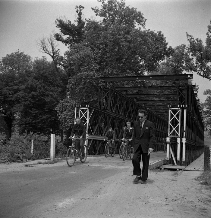 Source. Le pont 1, en 1949 avant son démontage en 1965-1966, il s'agit d'un Triple-Triple TT avec une passerelle latérale pour piétons de chaque côté. Sortie du pont vue depuis la berge de la rive droite, on aperçoit la Prairie sur la droite de la photo. Les cyclistes et le piéton (des étudiants selon la légende canadienne !) reviennent donc du Centre Ville et viennent de traverser la Prairie.