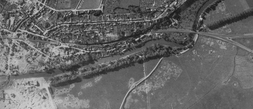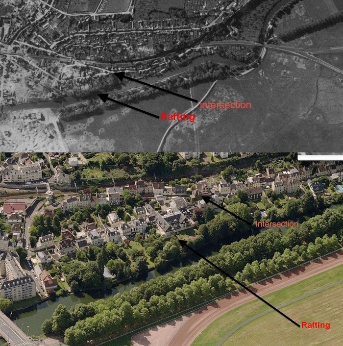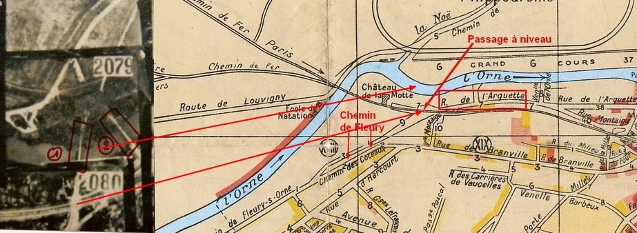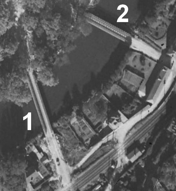 Photo aérienne IGN du 27 août 1946 deux ponts Bailey (références 1 et 2) un donnant à l'extrémité de la venelle de l'Orne et l'autre sur la côte de la Cavée (chemin des Coteaux).