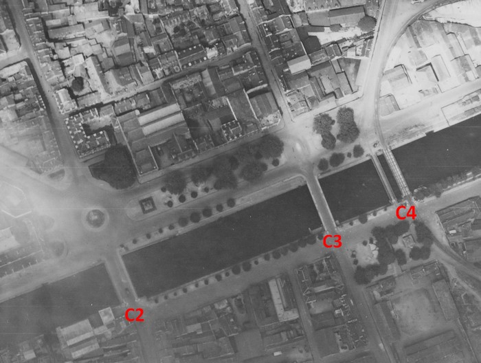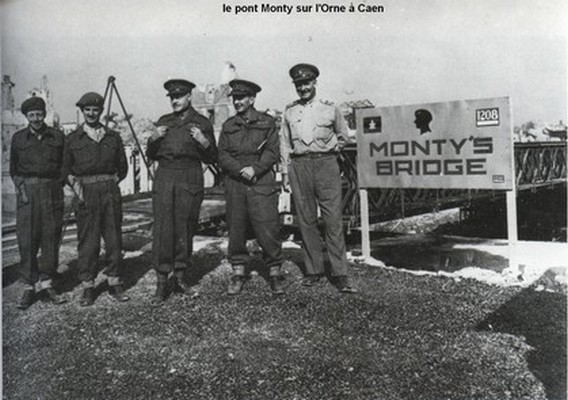 "Photo Archives municipales de Caen" le 27 août 1946, par rapport aux photos de juillet et août 1944 on observe: de gauche à droite (de l'amont à l'aval) le Monty's bridge, une passerelle qui supporte la conduite d'eau de Moulines, le Winston bridge, une nouvelle passerelle et le Churchill bridge passé à deux voies de circulation.