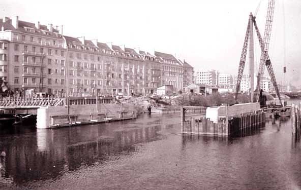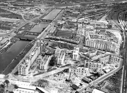 La construction des tours Marine est terminée, l'avenue du 6 juin tracée, à gauche la rue Saint Jean avec son nouveau tracé en amont du Monty's bridge; le pont Winston Churchill est en construction en aval une passerelle et le Churchill bridge toujours en service.