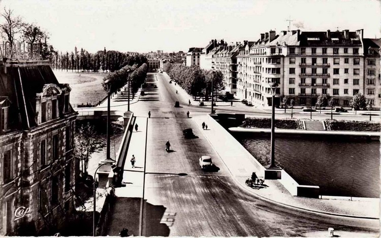 Mais c'est surtout la passerelle qui fut utilisée par les Allemands. Elle n'avait pas été atteinte par l'avalanche de bombes qui avait anéanti la caserne Hamelin, les quais voisins, les maisons de la rue Albert-Le-Duc et défoncé le cours Sadi-Carnot, la partie voisine de la Prairie et même le Grand Cours. Seuls, des éclats avaient détérioré le garde-fou, mais son élégante silhouette arquée continuait de se détacher toute blanche des masses sombres de la verdure et de se refléter dans l'eau de la rivière semée de nénuphars.