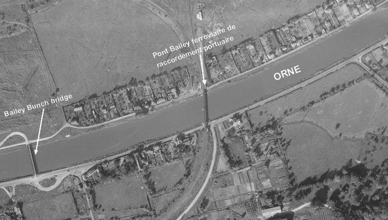 Photo IGN août 1947. Le Bailey Layr bridge ainsi que le Bunch bridge (plus en aval à Mondeville) ont été construits par les Anglais pour exploiter le port de Caen.