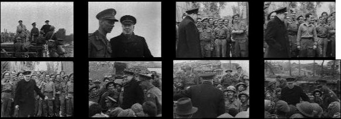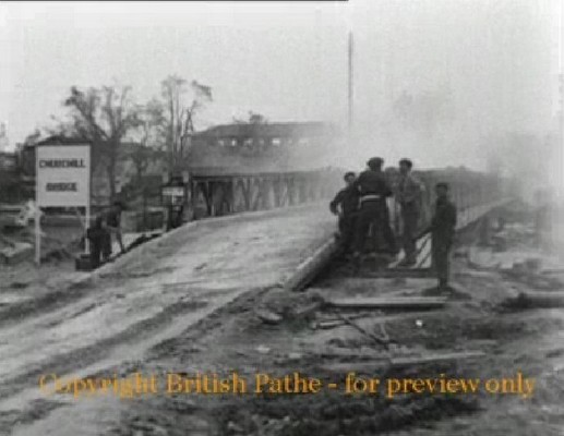 A gauche: capture écran de ce film qui montre le Churchill Bridge simple, le photographe est rive gauche. Regardez le bâtiment en arrière-plan à gauche ce sont les abattoirs, hors le Churchill est dans l'axe des abattoirs.