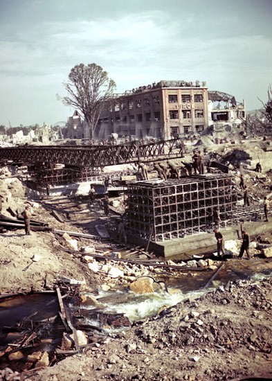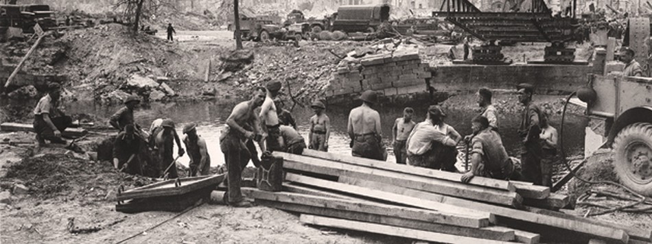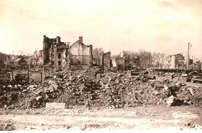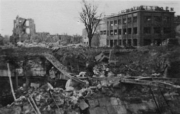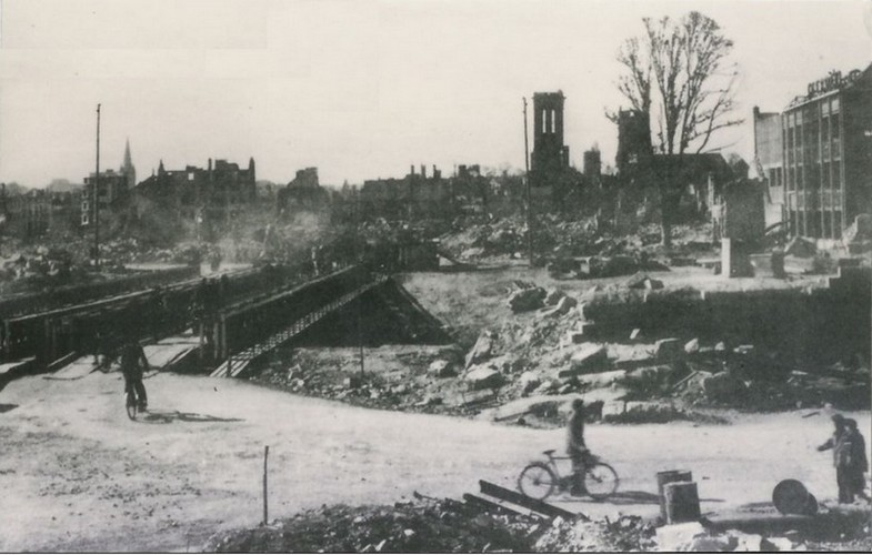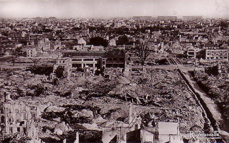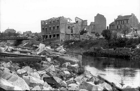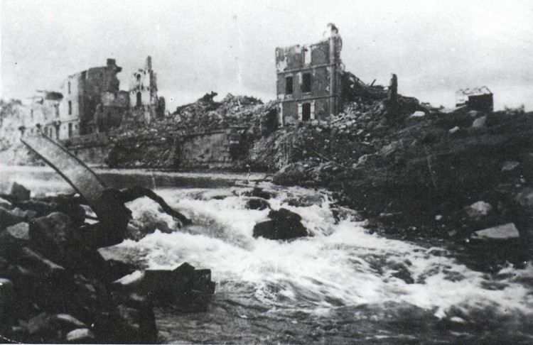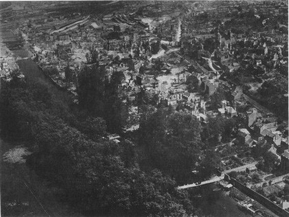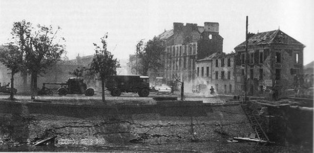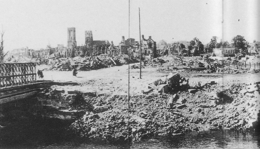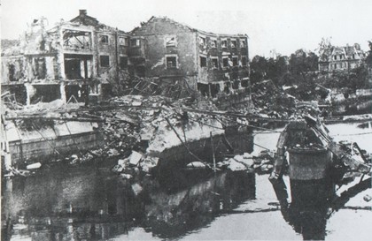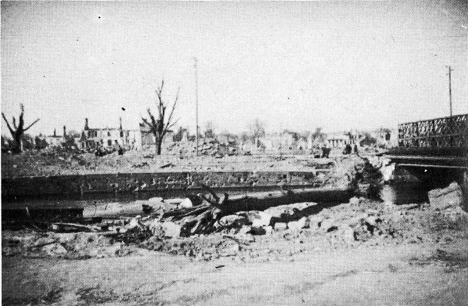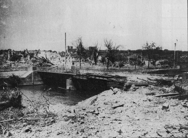 Pont de la rue de la Gare après les premiers bombardements dans le fond l'Abbaye aux Dames, l'église de la Trinité