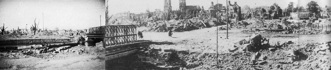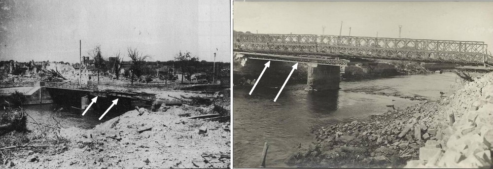 Quatre photos du pont de Vaucelles de plus en plus en ruines au fur et à mesure des bombardements: