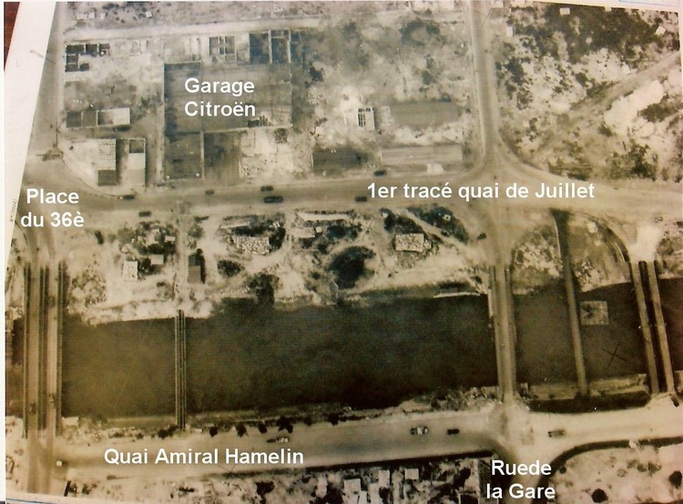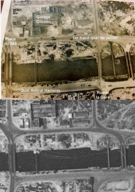 "Photos Ouest-France" Travaux quai de Juillet au niveau du futur Pont Churchill ; photo de gauche: à l'arrière plan, le pont Bailey Monty's bridge, à droite le garage Citroën.