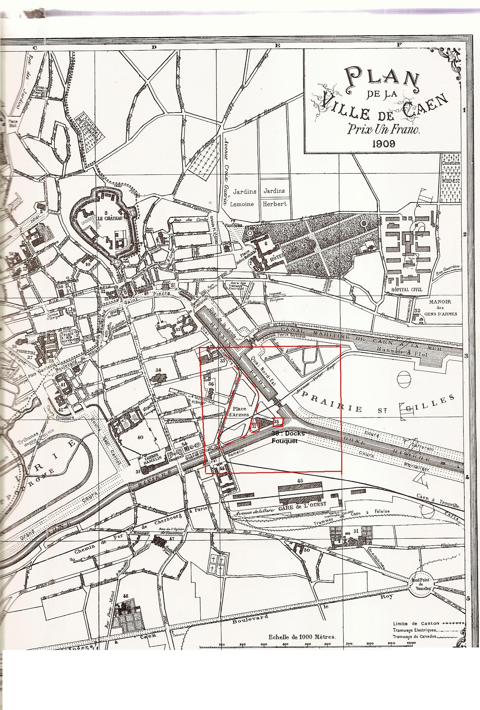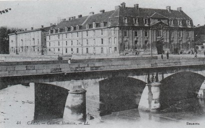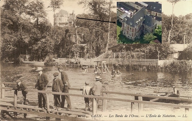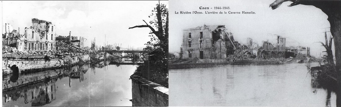 "Photo collections du Mémorial de Caen" présentée page 103 de ce livre. La passerelle dans l'Orne en arrière plan la propriété Legallais-Bouchard N°1 rue du Puits de Jacob.
