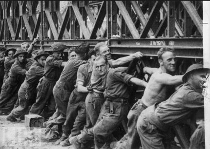 Le 5 juillet sur le tablier du pont du Tortillard, les Allemands disposent un épais plancher de bois pour faciliter la circulation des renforts qui montent vers Lébisey et Cambes.
