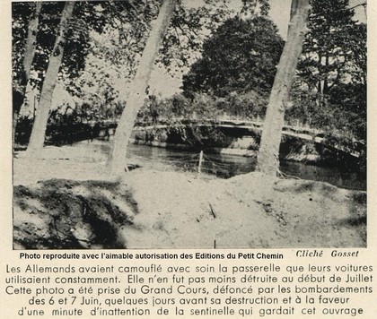 Faisant flèche de tout bois, les Allemands avaient, dès le 8 juin, aménagé les entrées de la passerelle pour en faciliter l'accès aux automobiles. Et comme son éclatante blancheur, au soleil de juin, désignait avec trop d'indiscrétion sa présence aux aviateurs alliés, ils avaient entrepris de la camoufler habilement avec des branchages et de la transformer en un étroit couloir de verdures.