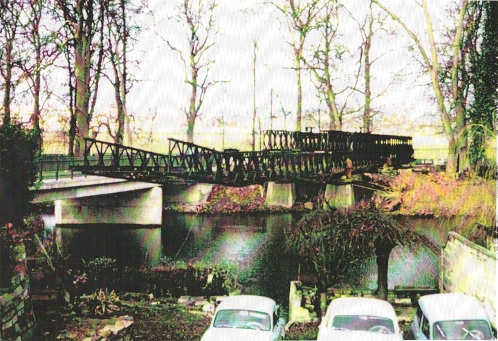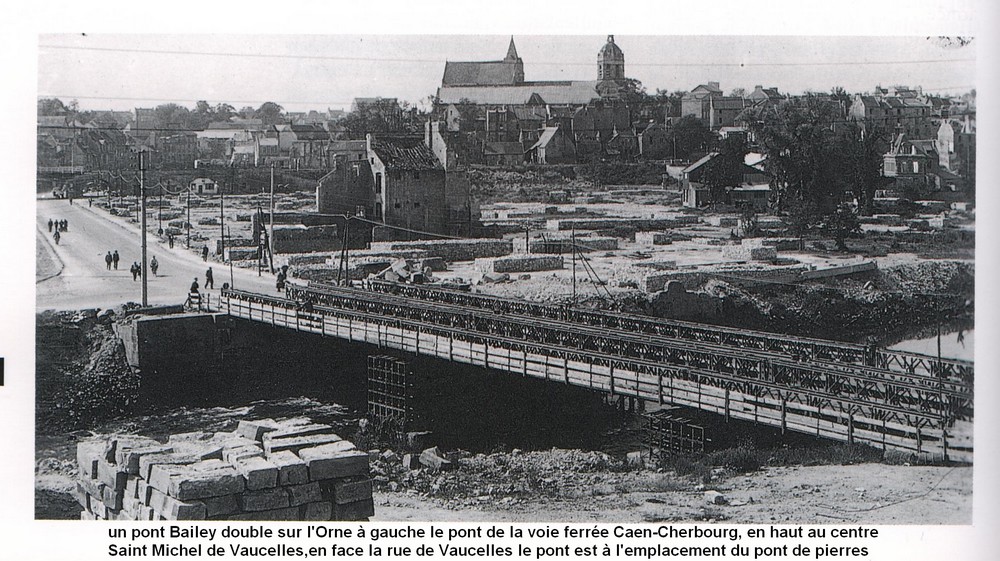 Les deux tabliers du pont de la Mutualité dans l'Orne juste en amont le Bailey Churchill, le photographe est rive droite, en arrière plan à gauche le garage Citroën et à droite l'église Saint Jean.
