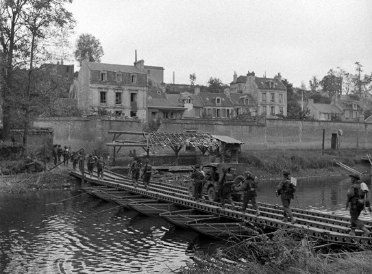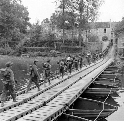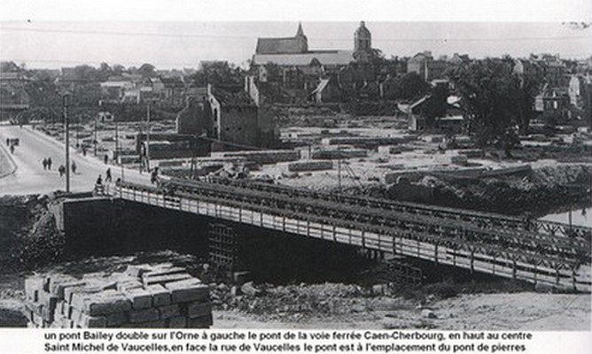 Mais la passerelle ne rendit pas service qu'aux Allemands. Elle permit, pendant tout le mois de juin et les premiers jours de juillet, aux civils, de passer de l'une à l'autre rive, à pied... et en voiture... Camions de ravitaillement amenant des vivres à Caen, voitures sanitaires, l'empruntèrent bien souvent, ainsi que les Caennais qui gagnaient la campagne et les Vaucellais qui venaient aux nouvelles.