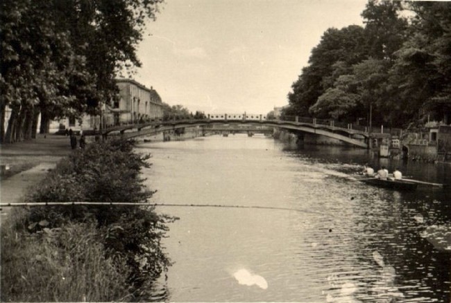 Photo prise par un soldat allemand pendant l'occupation. La passerelle de l'Arquette ou Nouvelle passerelle codée C1 qui relie le cours Sadi Carnot et la rue du Puits de Jacob, à gauche la caserne Hamelin en arrière-plan le pont de Vaucelles.